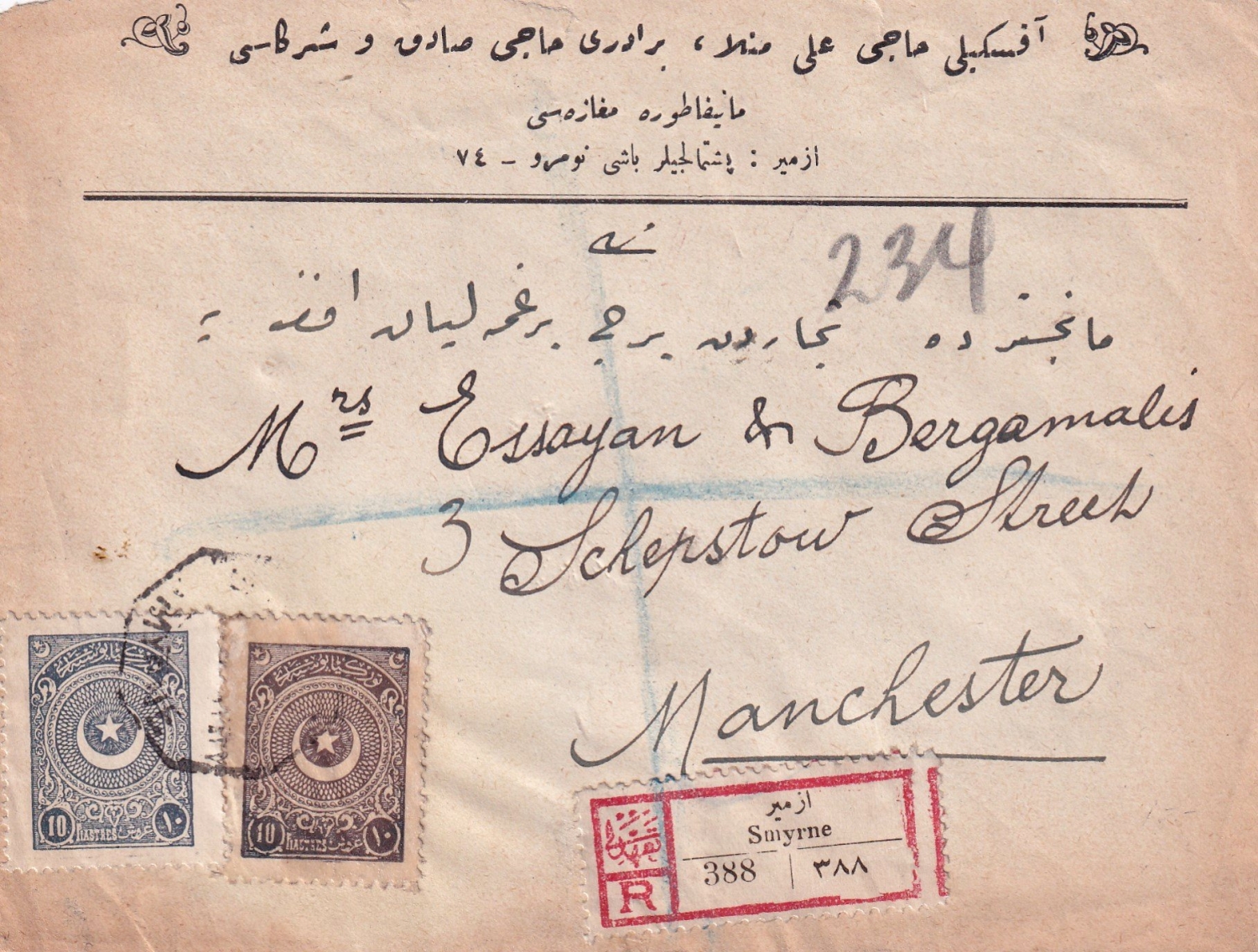 Osmanlıca Aksekili Hacı Ali Molla, biraderi Hacı Sadık ve Şürekası Manifatura Mağazası, İzmir antetli zarf, postadan geçmiş, Manchester, İngiltere adresli