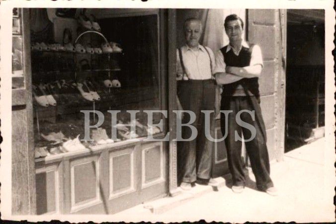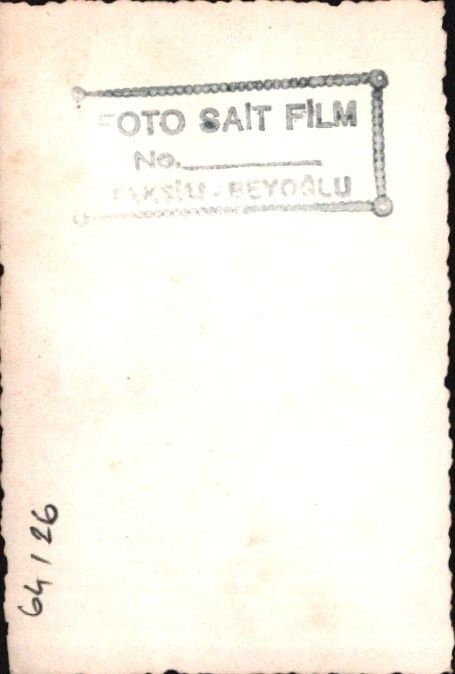 Bir ayakkabı mağazası önünde hatıra fotoğrafı, "Foto Sait Film - Taksim / Beyoğlu" damgalı, 9x6 cm