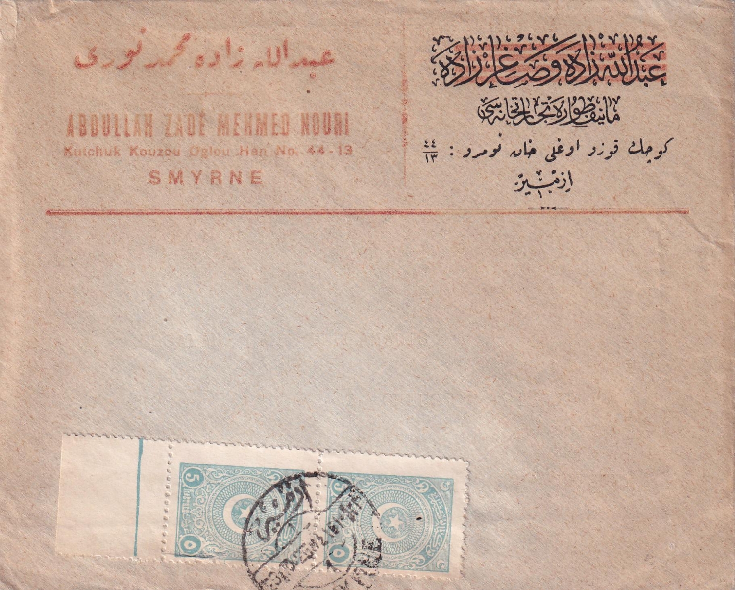 Osmanlıca Fransızca iki dilde Abdullahzade Mehmed Nuri, İzmir antetli zarf, postadan geçmiş