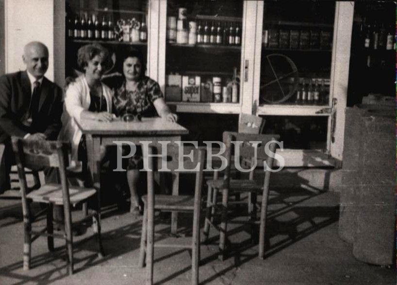 Bir bakkal vitrininin önüne kurulan masada oturan hanımlar ve beyefendi, 10x8 cm