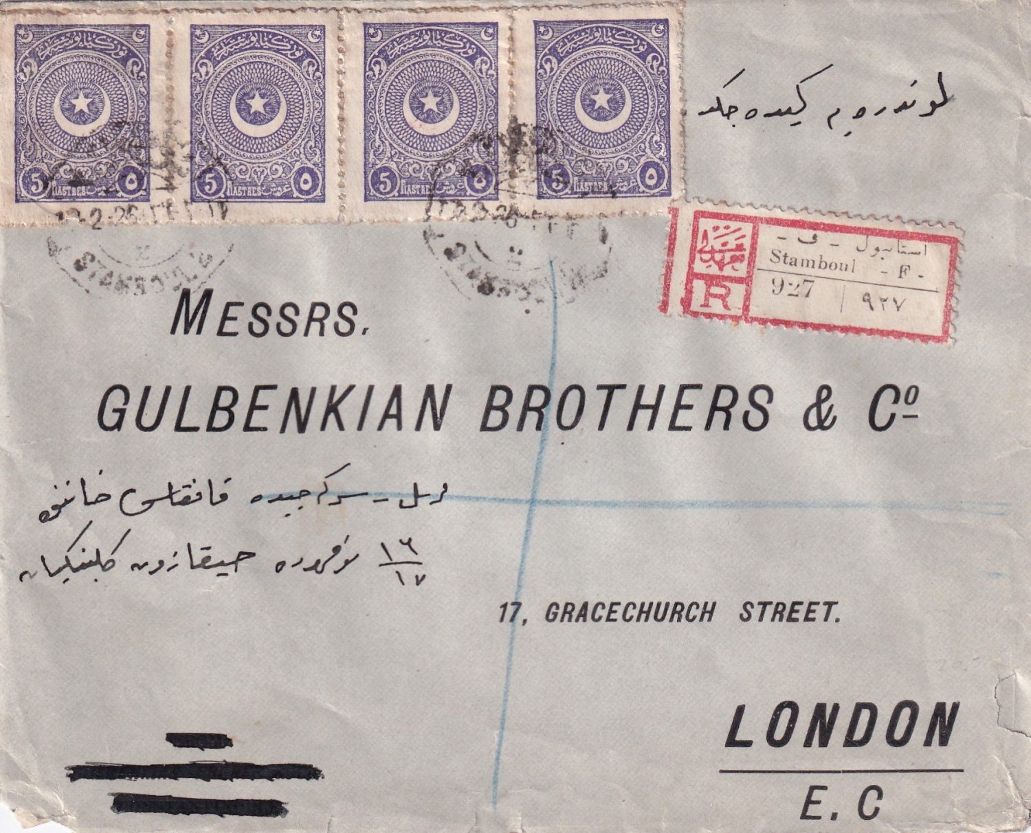 Messrs, Gulbenkian Brothers & Co antetli zarf, postadan geçmiş, Londra adresli