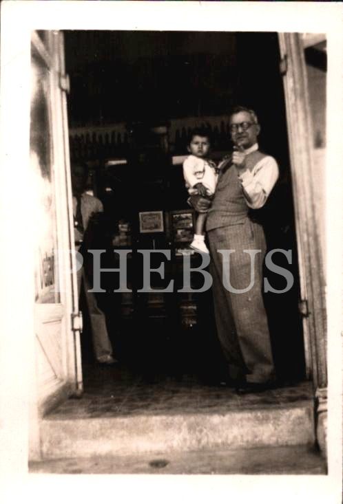 Kucağında küçük bir çocuk ile dükkânının girişinde poz vermiş beyefendi, 6x9 cm