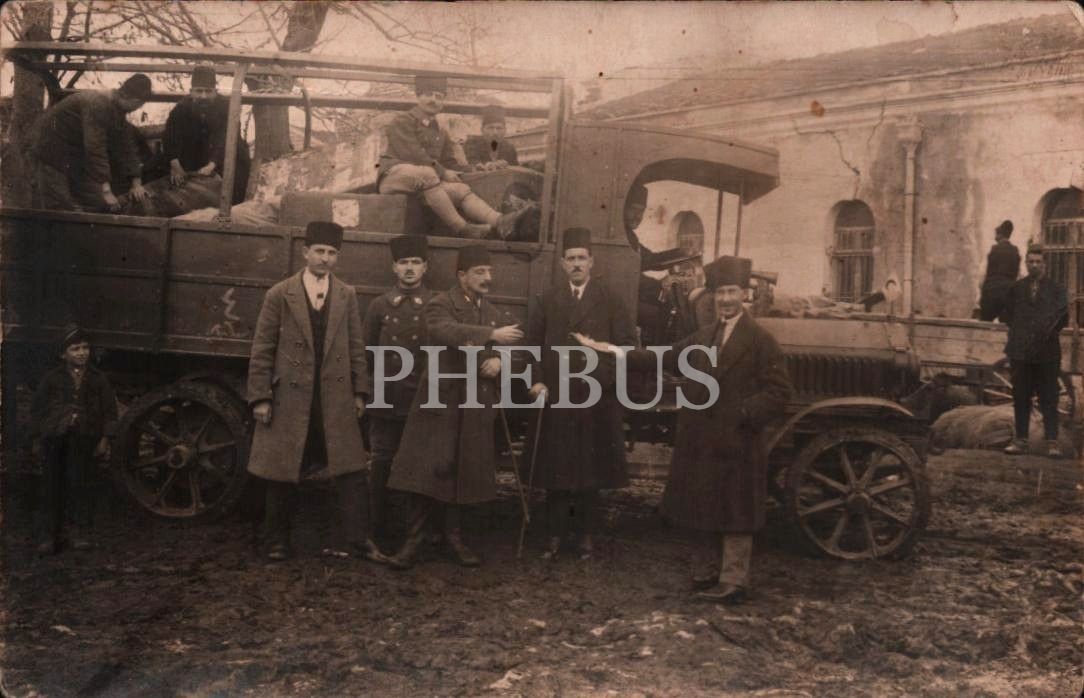 Osmanlı döneminden Kızılay bayraklı, 4 numaralı kamyonetle yük ve insan transfer eden askerler, 14x9 cm