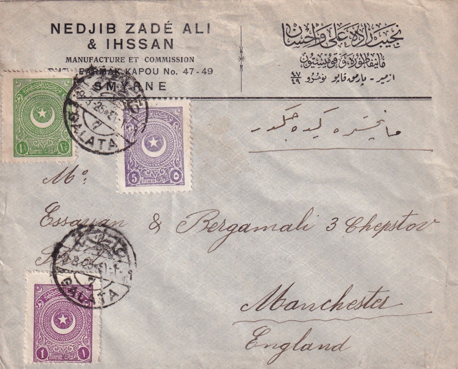 Osmanlıca Fransızca iki dilde Necibzade Ali ve İhsan Manifatura Kumpanyası, İzmir antetli zarf, postadan geçmiş, Manchester, İngiltere adresli