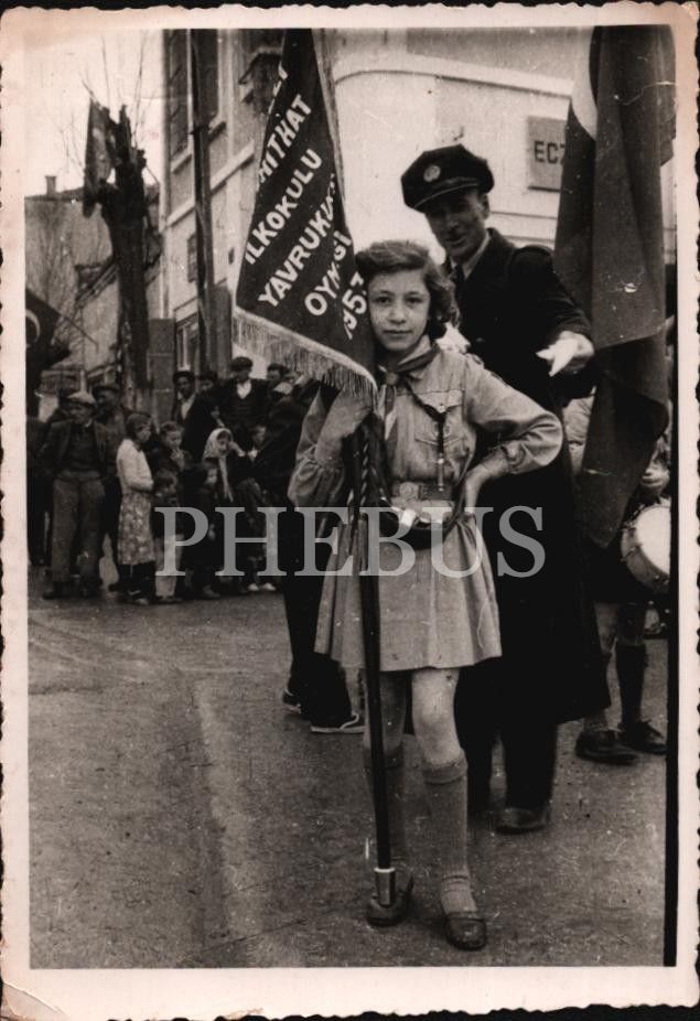 Bir ilkokulun "Yavrukurt Oymağı" yazılı izci flamasını taşıyan küçük kız, 8x12 cm