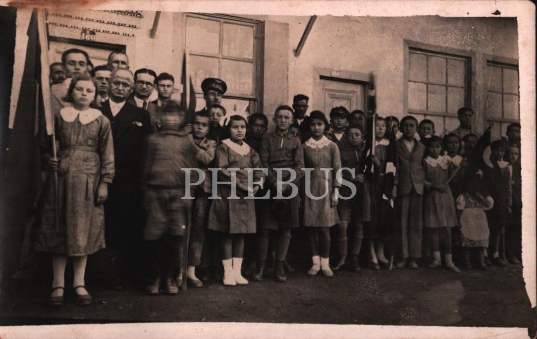 Ellerinde Türk bayraklarıyla milli bayram kutlamasına hazırlanan öğrenciler ile öğretmenleri, 14x9 cm