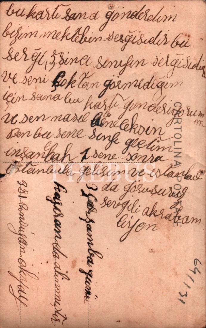 Çeşitli elişleriyle çizimlerin sergilendiği bir mektep sergisi, bir öğrenci tarafından arkadaşına ithaflanmış, 14x9 cm
