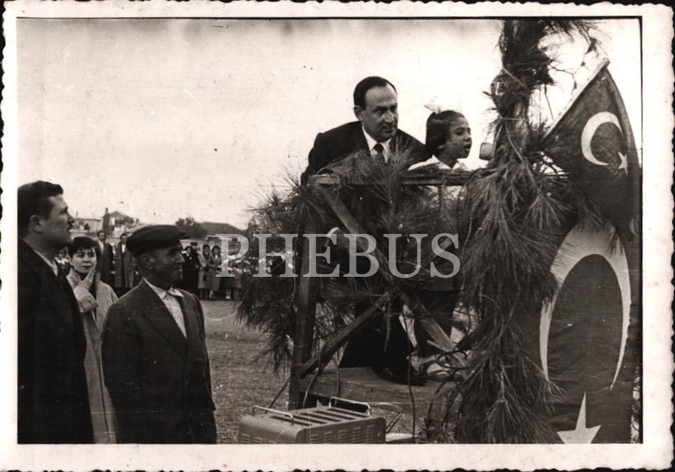 Türk bayrakları ve yeşilliklerle süslü kürsüye çıkarak dinleyicilere hitaben konuşma yapan küçük öğrenci, 12x9 cm