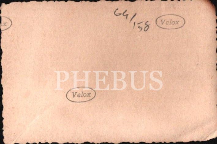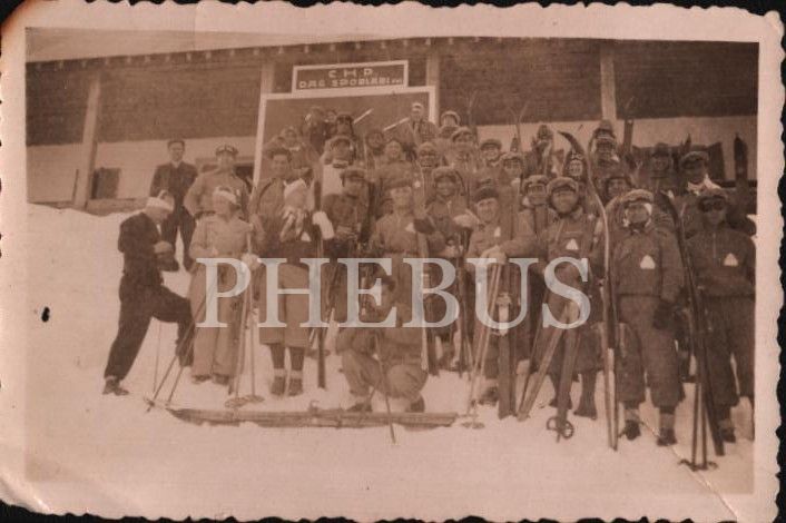 "C.H.P. Dağ Sporları Evi" önünde kayak takımlarıyla poz veren topluluk, 9x6 cm