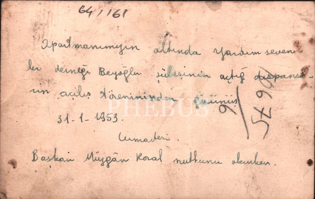 "Apartmanımızın altında yardım sevenler derneği Beyoğlu şübesinin açtığı dispanserin açılış töreninden görünüş. 31-1-1953. Başkan Müjgân Koral nutkunu atarken."