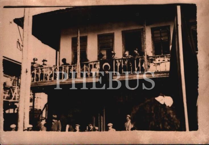 Türk bayrağı asılı eski bir köşkün balkonundan milli bayram törenini izleyen protokol mensupları, 10x7 cm