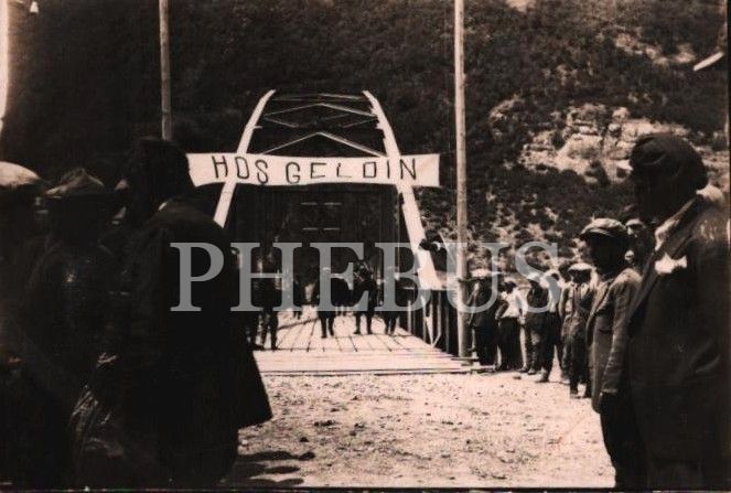 "Hoş Geldin" pankartı asılı köprü üzerinde ve çevresinde yöre halkı, 9x6 cm