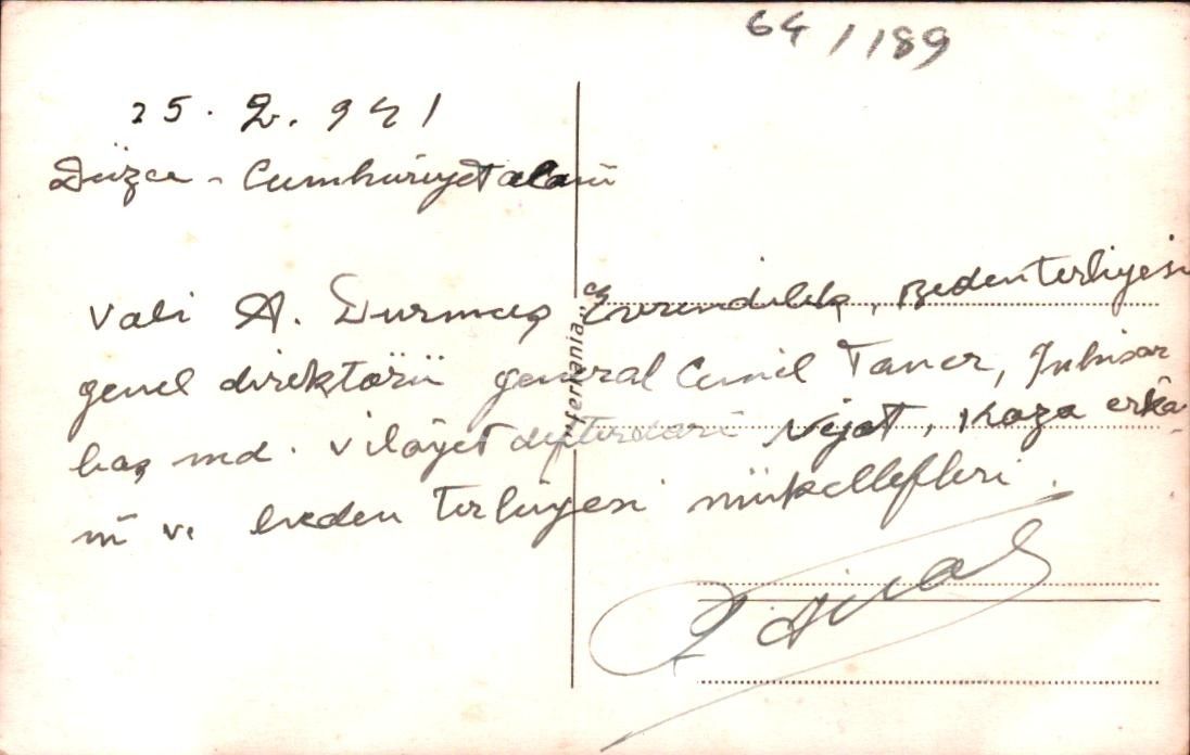 "25.2.941 Düzce - Cumhuriyet Alanı. Vali A. Durmuş ?, Beden Terbiyesi Genel Direktörü General Cemil Taner, İnhisar Baş Md. Vilâyet Defterdarı Nejat, kaza erkânı ve Beden Terbiyesi Müfettişleri."