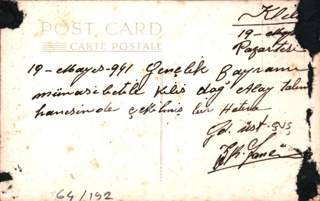 "Kilis - 19 Mayıs 941 Pazartesi. Gençlik Bayramı münasebetile Kilis dağ Alay talimhanesinde çekilmiş bir hatıra..."