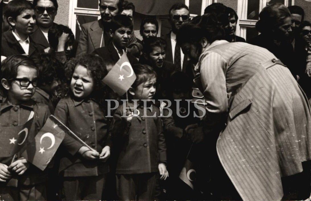 "İyi Ahlak Kurdelesi" kazanmaya hak kazan Burak Özdal isimli öğrenci, öğretmeni tarafından tebrik edilirken, 23 Nisan 1972, 14x9 cm
