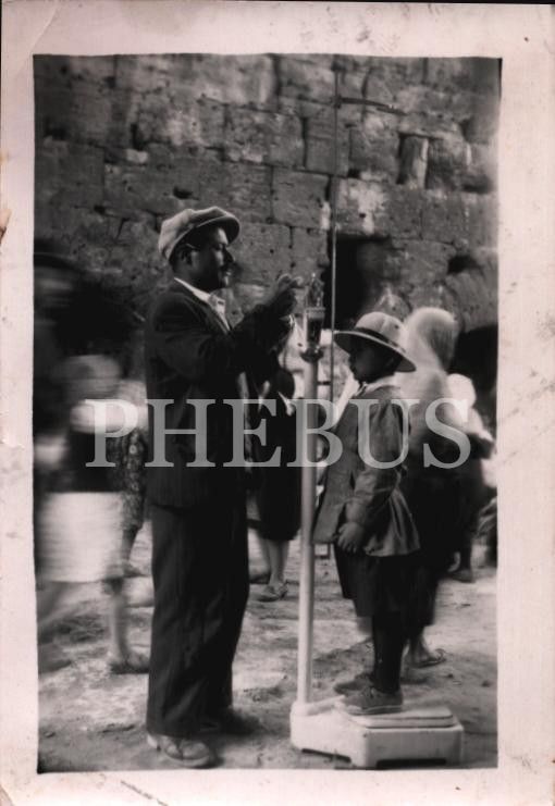 Küçük bir çocuğun kilosunu ölçen tartıcı, "Foto Park / Denizli" damgalı, 7x10 cm