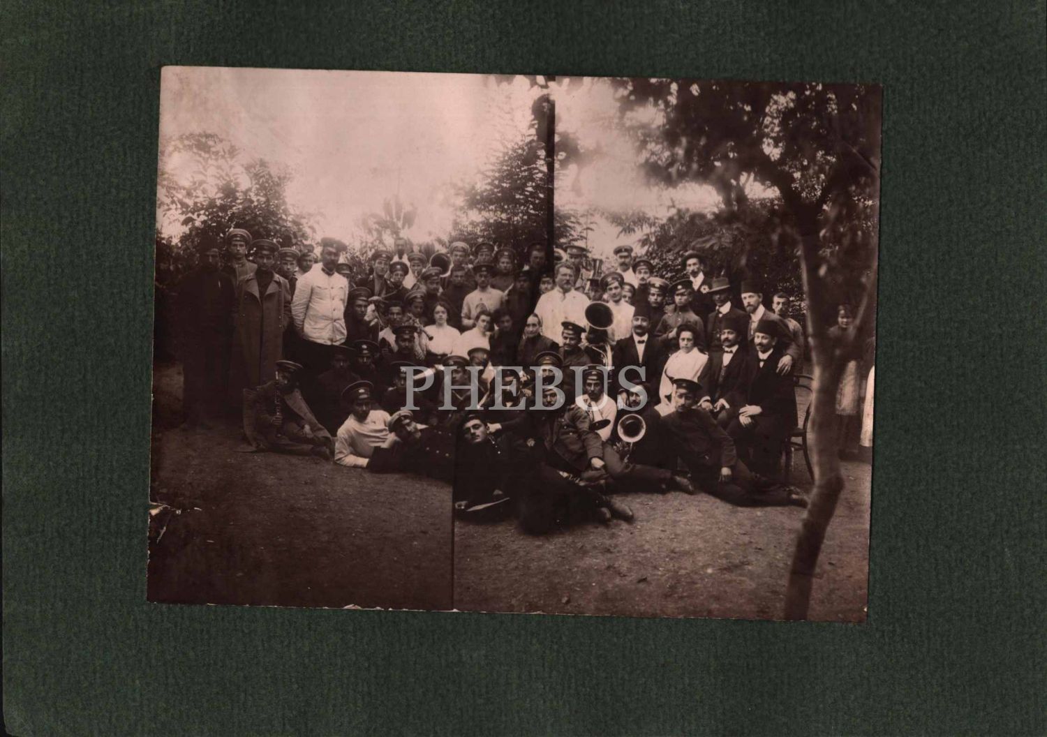 İşgal İstanbul'unda ellerinde çeşitli müzik enstrümanları bulunan işgal kuvvetleriyle poz veren fesli Osmanlı beyefendiler, 20x15 cm