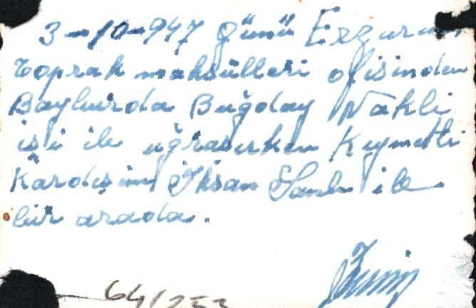 "3-10-947 günü Erzurum toprak mahsülleri ofisinden Bayburda buğday nakli işi ile uğraşırken Kıymetli Kardeşim İhsan Sanlı? ile bir arada. Emin"