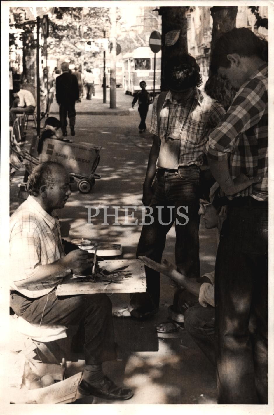 Seyyar kanaviçe ustası ile sohbet eden gençler, "Arslan Üst - Görülmüştür" damgalı, 12x18 cm