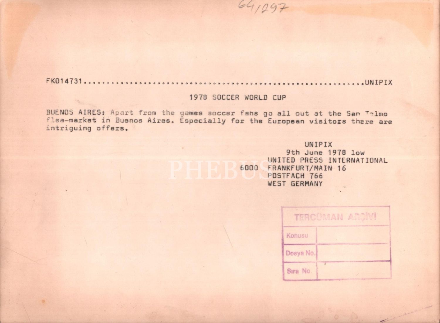 1978´de Arjantin´in ev sahipliği yaptığı FIFA Dünya Kupası´na katılan taraftarların Buenos Aires´teki bitpazarına yoğun ilgi gösterdiği ana dair bir basın fotoğrafı, 24x18 cm