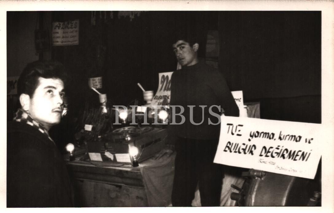 Bir elektronik eşya dükkânı çalışanları, teşhir alanında "Tuz yarma, kırma ve Bulgur Değirmeni" yazısı görülmekte, 14x9 cm