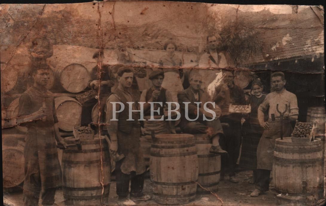 Osmanlı dönemi İzmirli Rum incir tüccarları ve işçilerin fıçılar ve kasalar çevresinde çektirdikleri toplu hatıra fotoğrafı, 14x9 cm