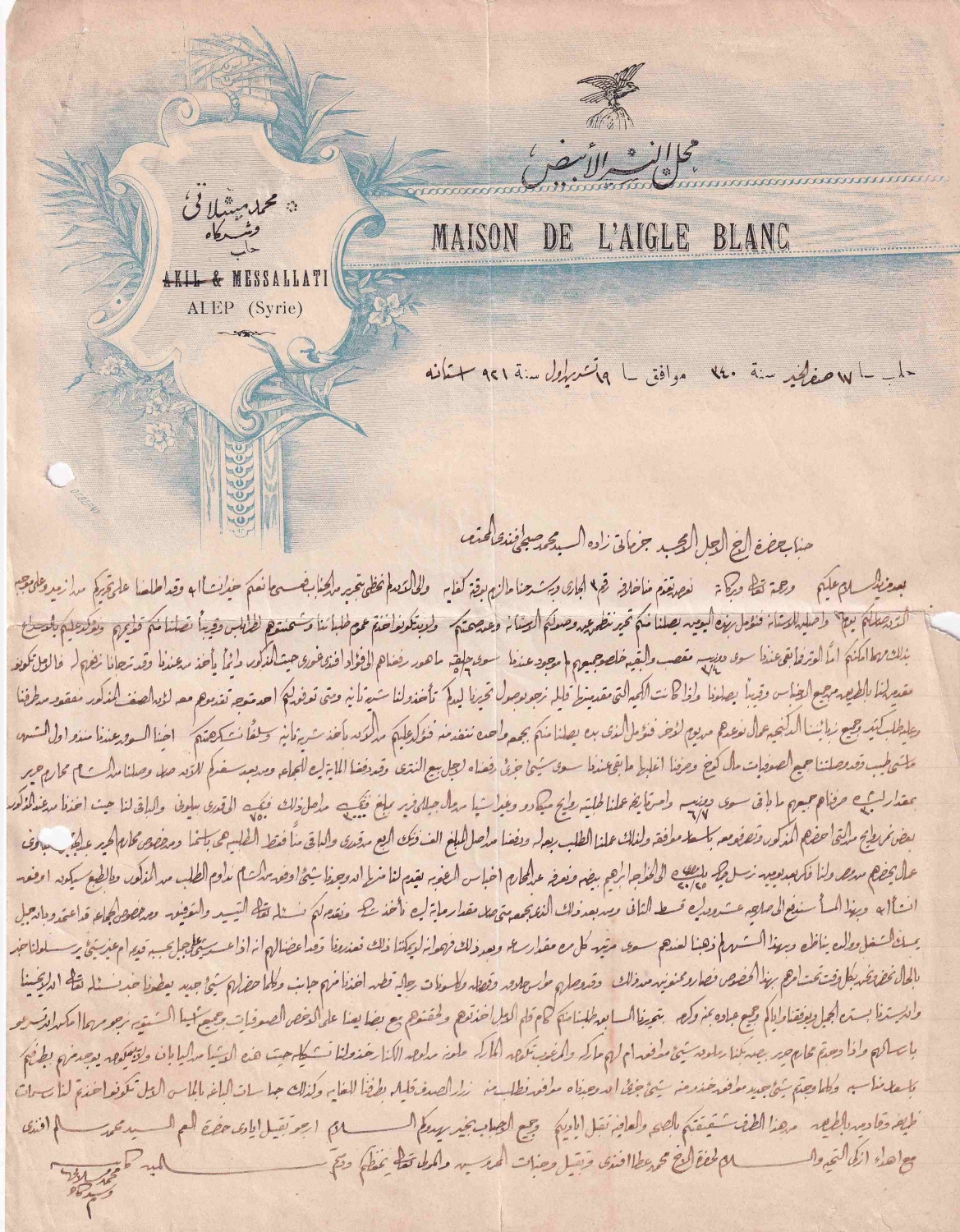 Arapça - Fransızca Muhammet Mesallatı Halep, Maison de L'aigle Blanc antetli doküman, Yün ve ip ticareti üzerine Mehmet Suphiye yazılmış Arapça evrak 1921 tarihli ve Muhammed Mesallatı imzalıdır. 20x28 cm