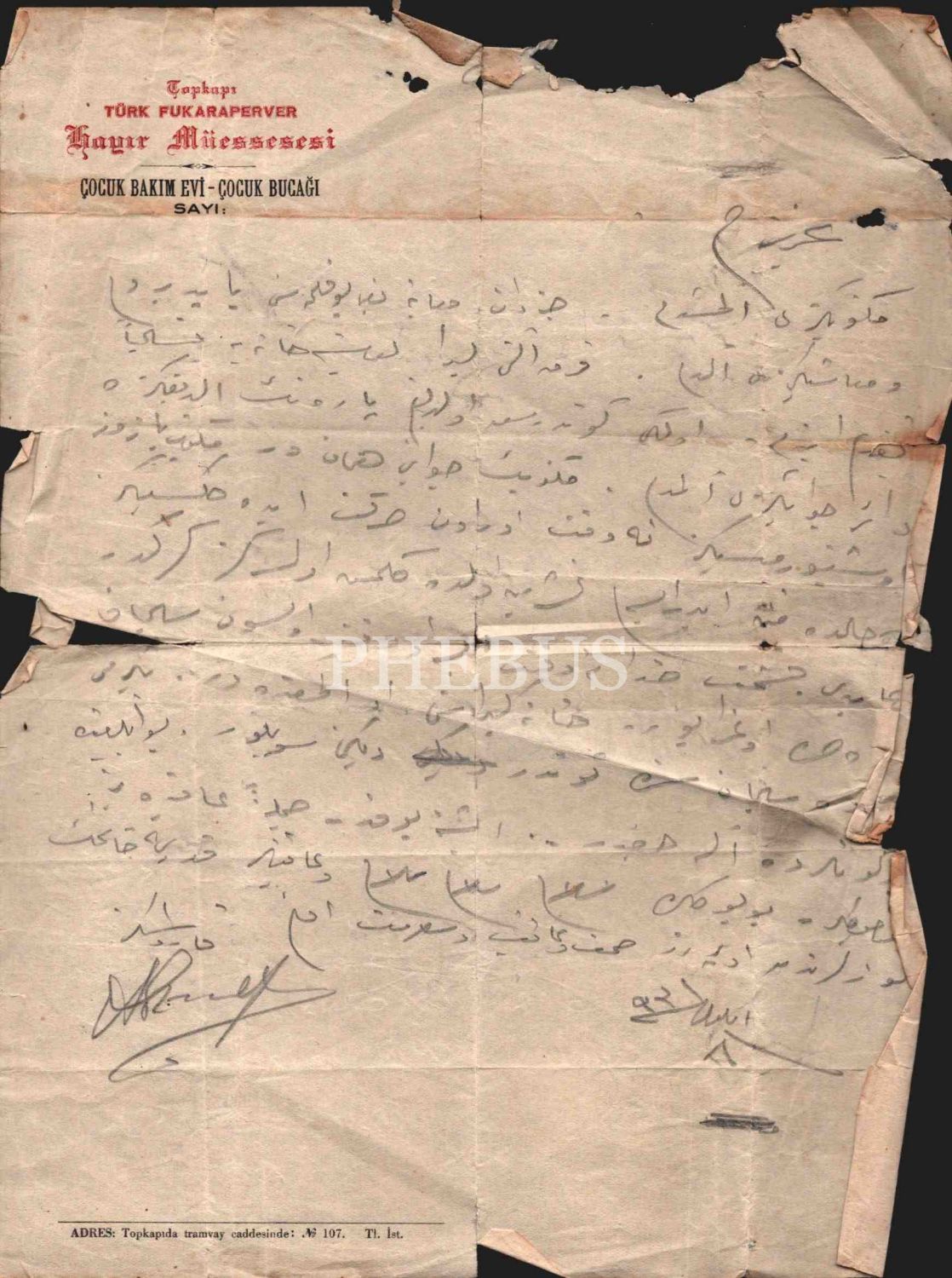 Topkapı Türk Fukaraperver Hayır Müessesesi antetli kâğıt üzerine yazılan 1931 tarihli mektup, 22x30 cm
