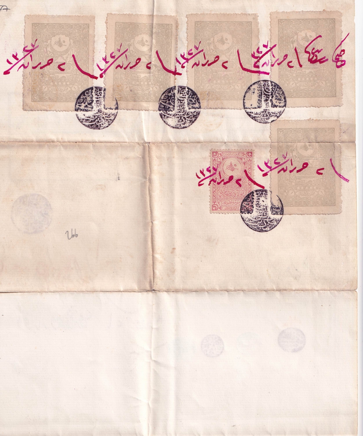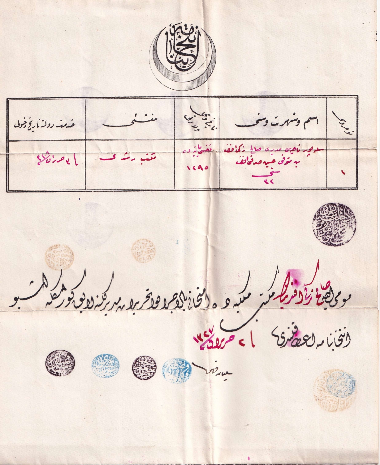 Osmanlıca hicri 1327 tarihli Salih Zeki Efendiye Mekteb-i Mülkiye'den verilmiş intihabname (sınav belgesi), 20x32 cm, arkasında Hicaz pulları