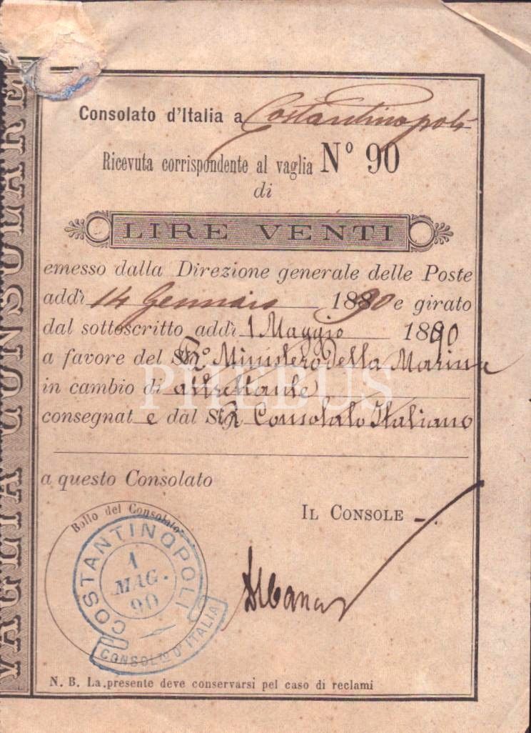 Yirmi liretlik İtalyanca makbuz, 1 Mayıs 1890, 9x13 cm