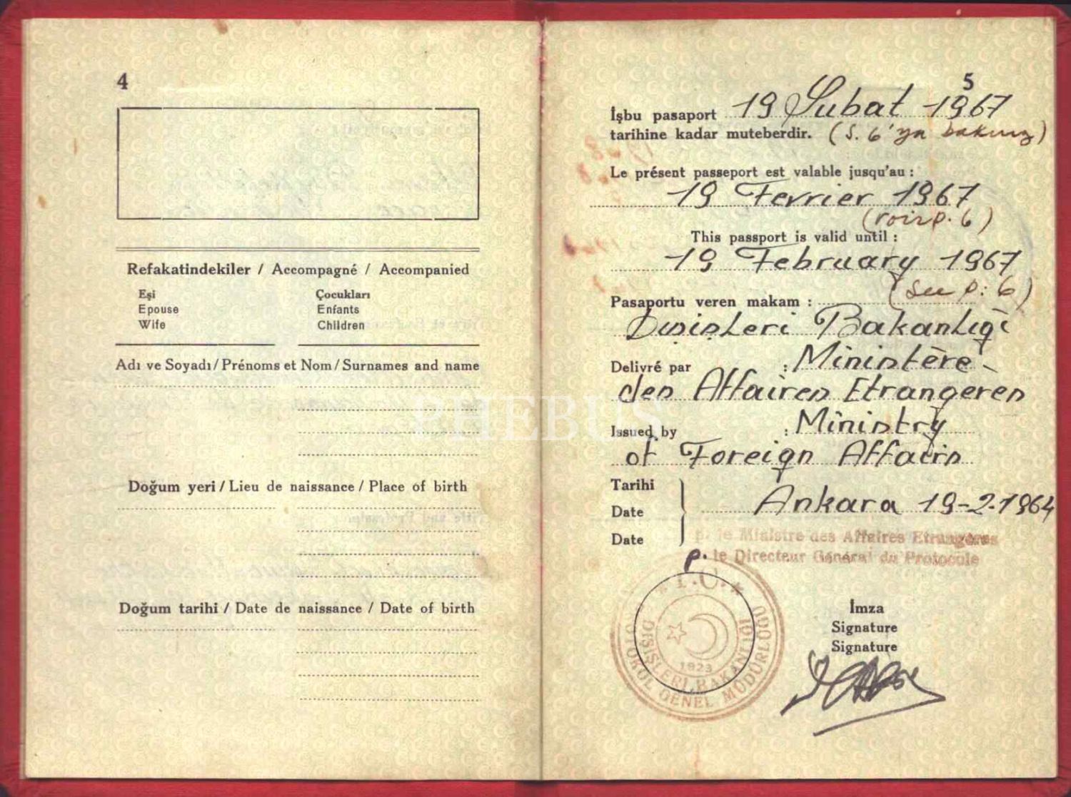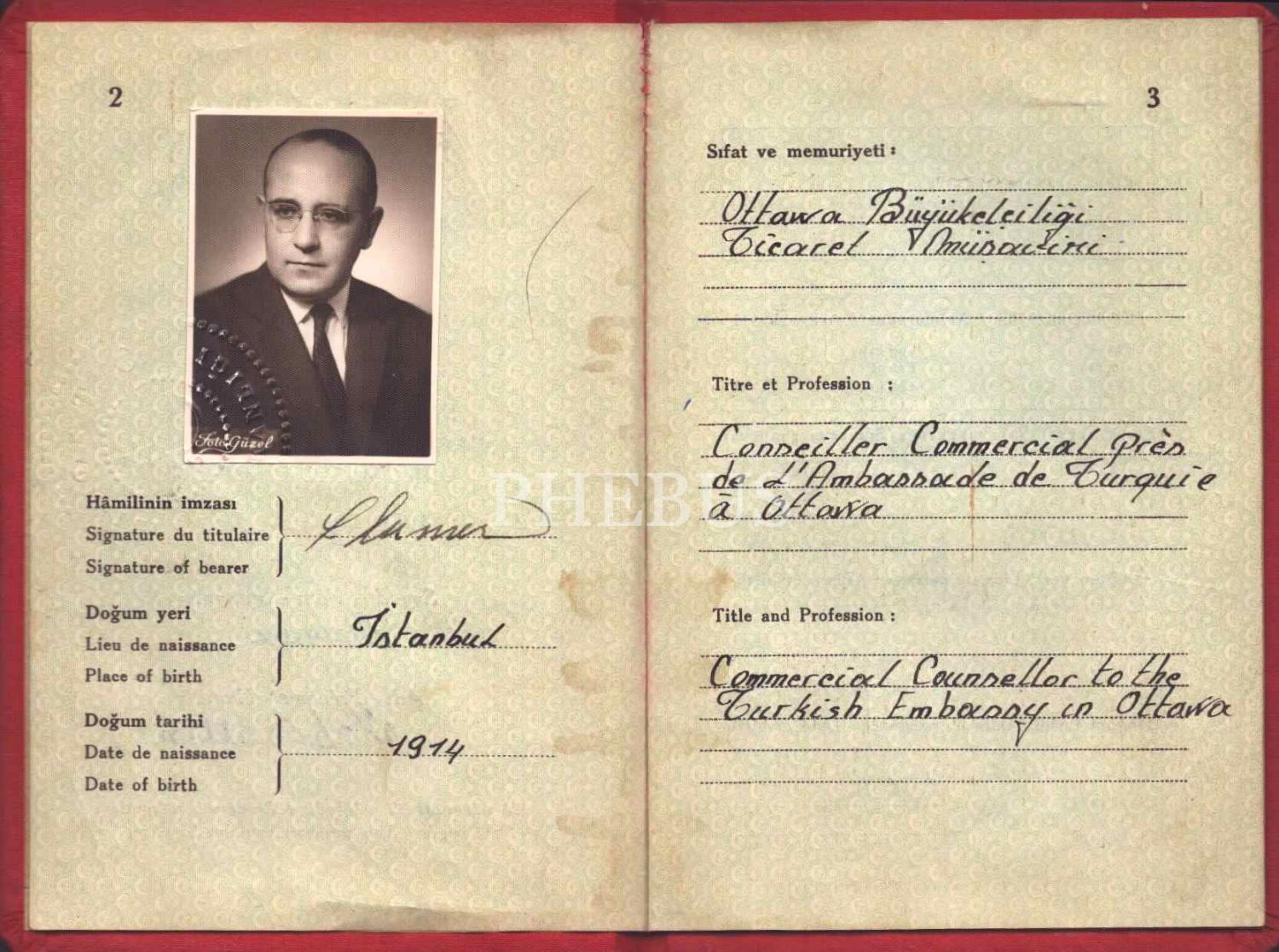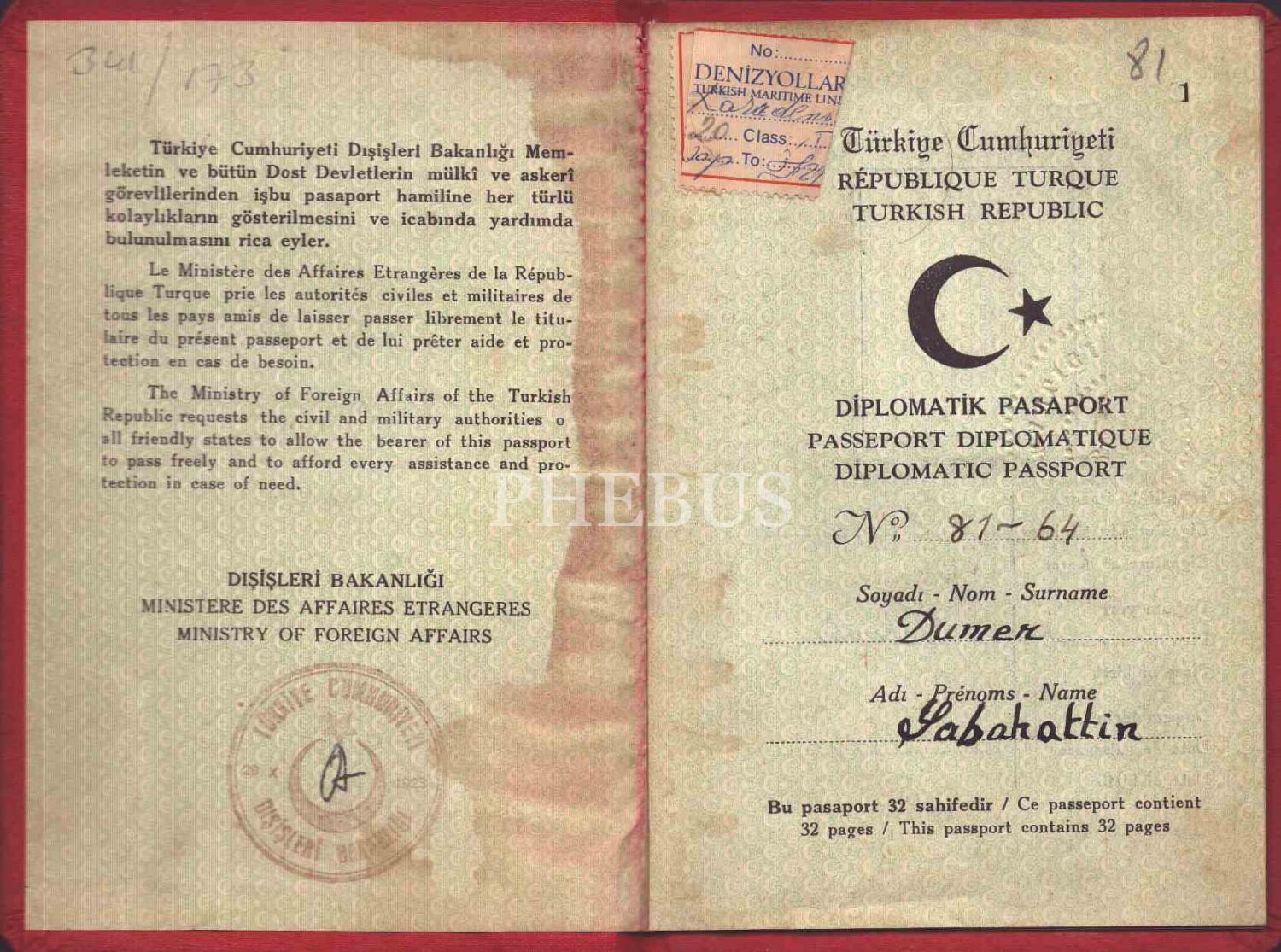 Ottawa Büyükelçiliği Ticaret Müşaviri Sabahattin Dumen´e ait diplomatik pasaport, 1964, 11x16 cm