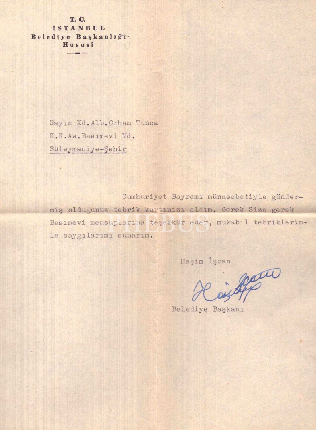 İstanbul Büyükşehir Belediye Başkanı Haşim İşcan imzalı, Cumhuriyet Bayramı tebrik mektubu, 1967, 18x25 cm