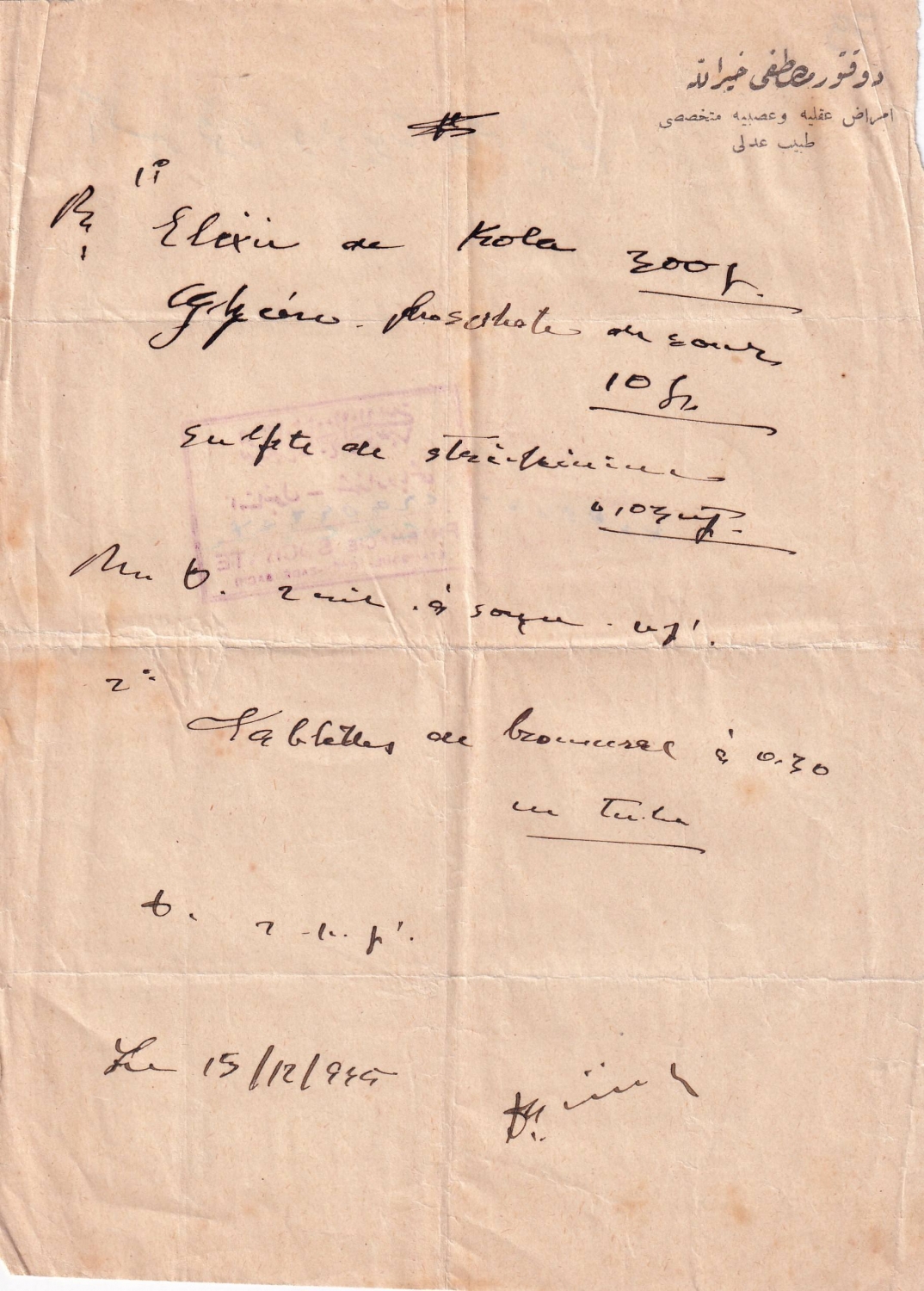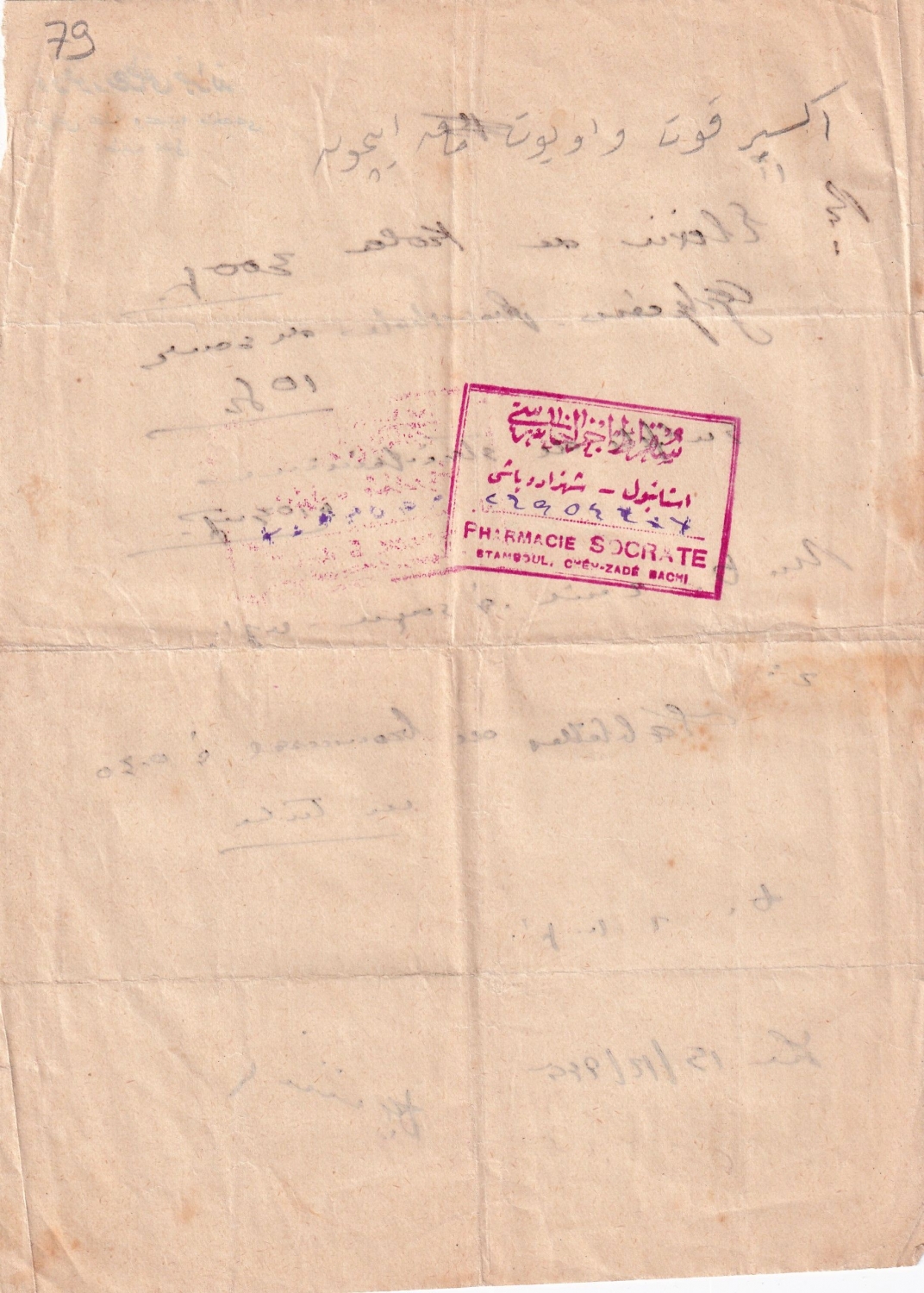 Osmanlıca Doktor Mustafa Hayrullah antetli reçete, 15x22 cm, arkası eczane kaşeli