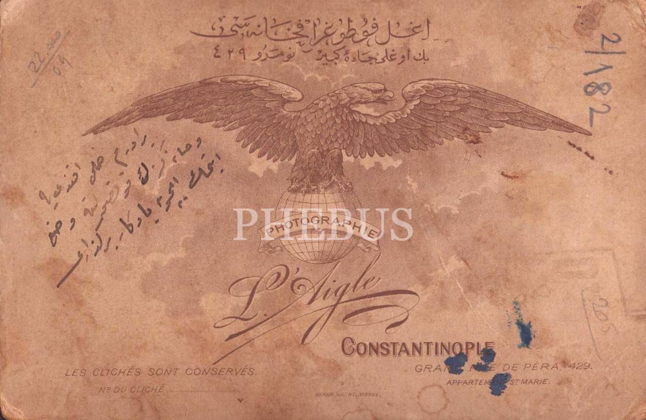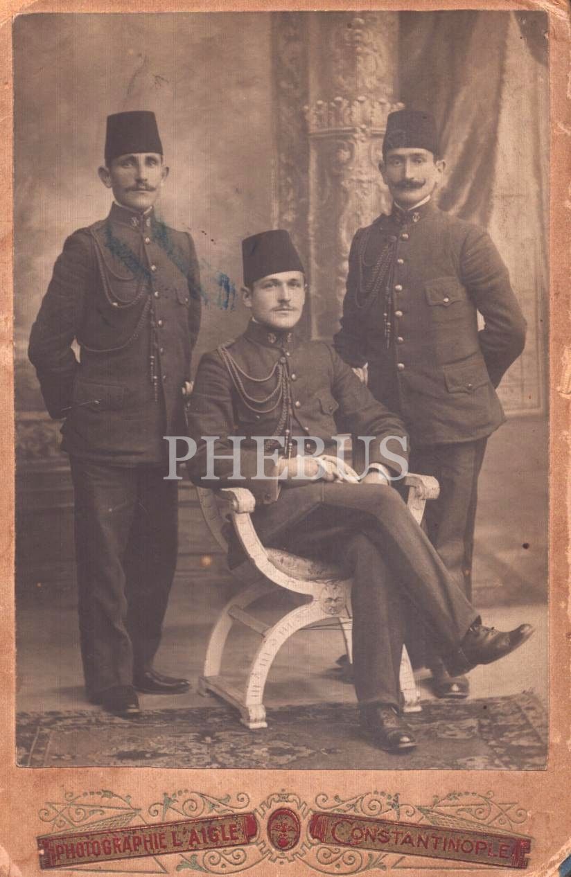 Mızıka-yı Hümâyun askerî bandosundan üç askerin hatıra fotoğrafı, L´Aigle Fotoğrafhanesi, 10x16 cm
