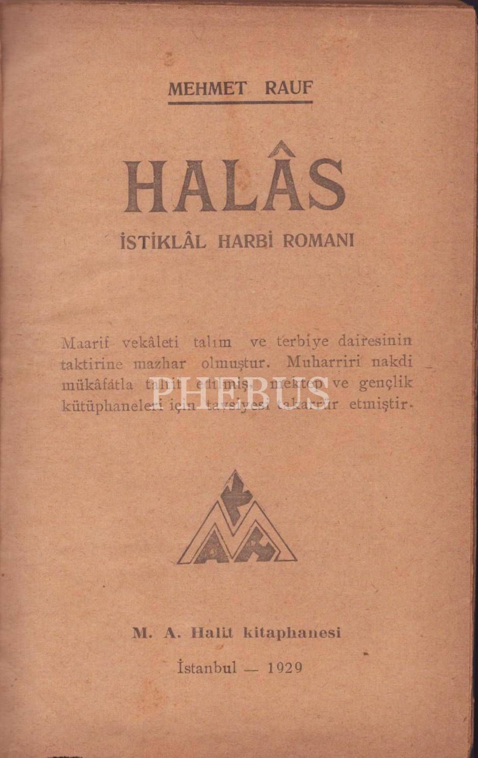 HALÂS - İstiklâl Harbi Romanı, Mehmet Rauf, 1929, M. A. Halit Kitaphanesi, birinci baskı