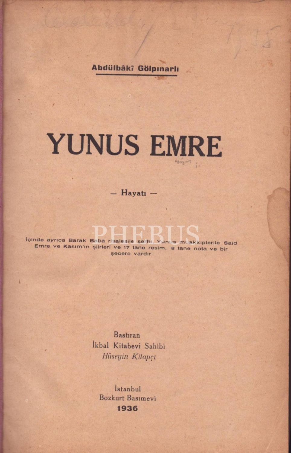YUNUS EMRE, Abdülbaki Gölpınarlı, 1936, İkbal Kitabevi, 340 sayfa, birinci baskı
