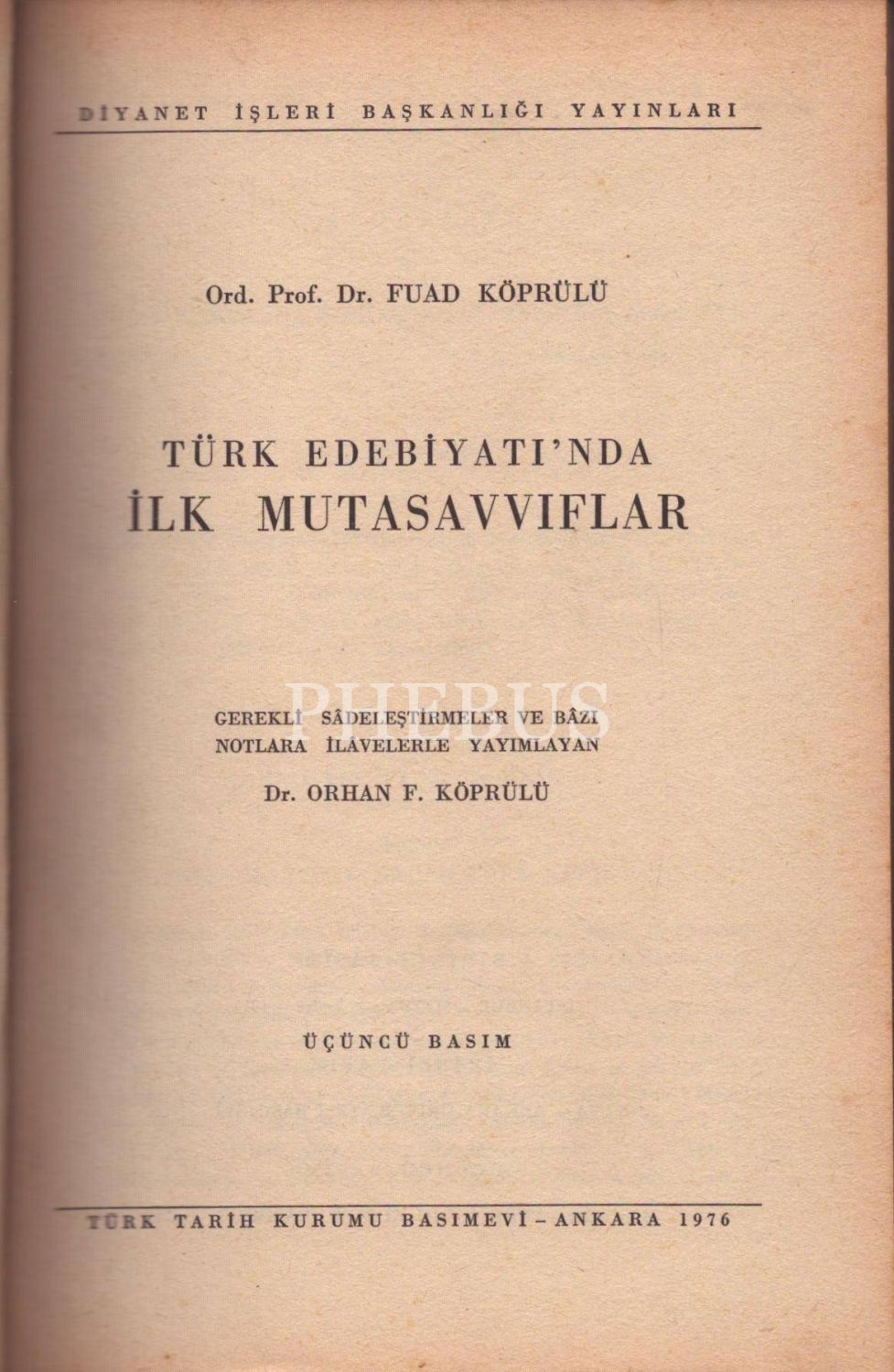 İLK MUTASAVVIFLAR, Ord. Prof. Fuad Köprülü, 1976, Diyanet İşleri Başkanlığı Yayınları, 416 + 20 sayfa