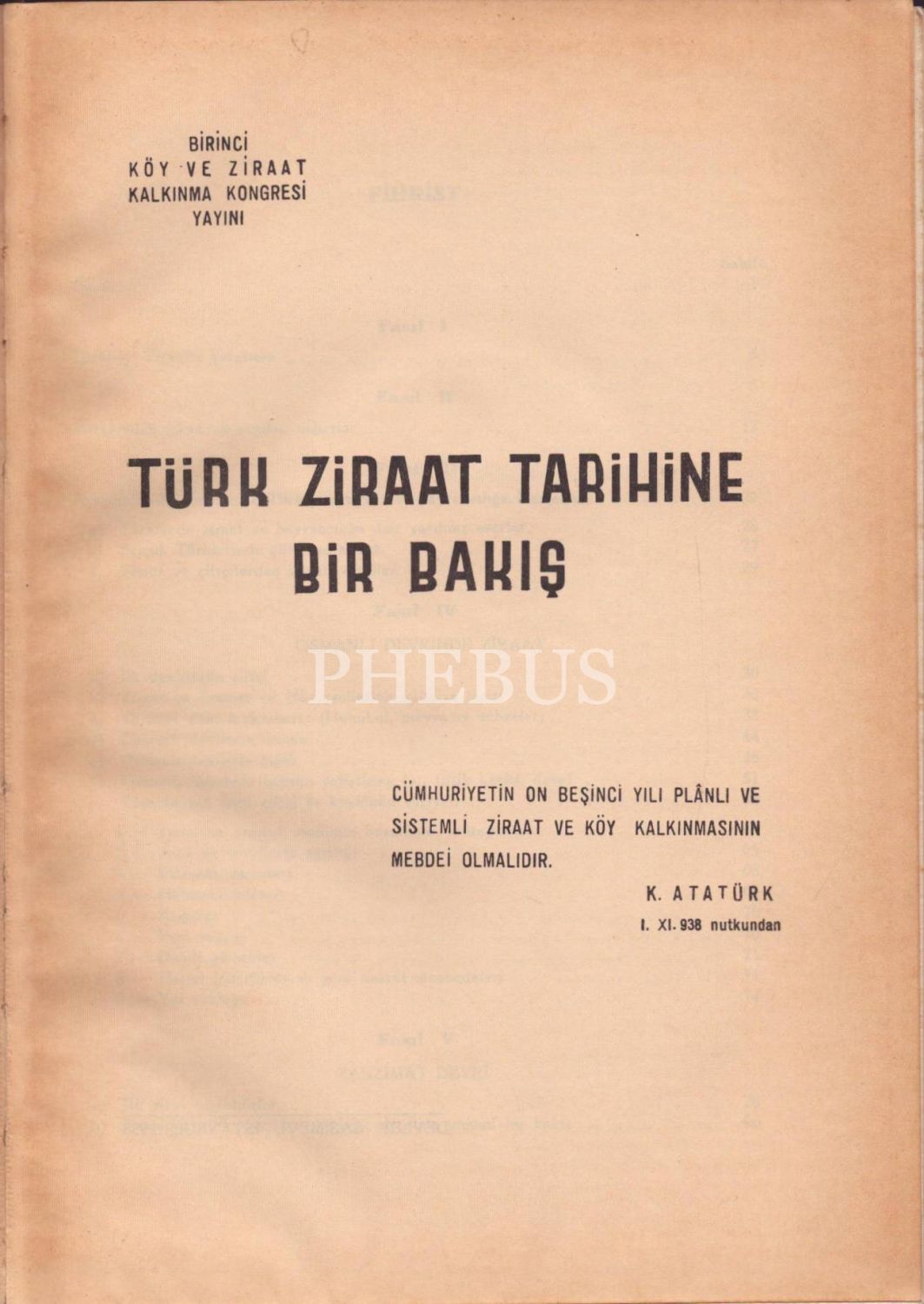 TÜRK ZİRAAT TARİHİNE BİR BAKIŞ, Komisyon, 1938, Birinci Köy ve Ziraat Kalkınma Kongresi Yayını, 304 sayfa + 14 sayfa ekler + 68 sayfa tablolar, planşlar, notalar