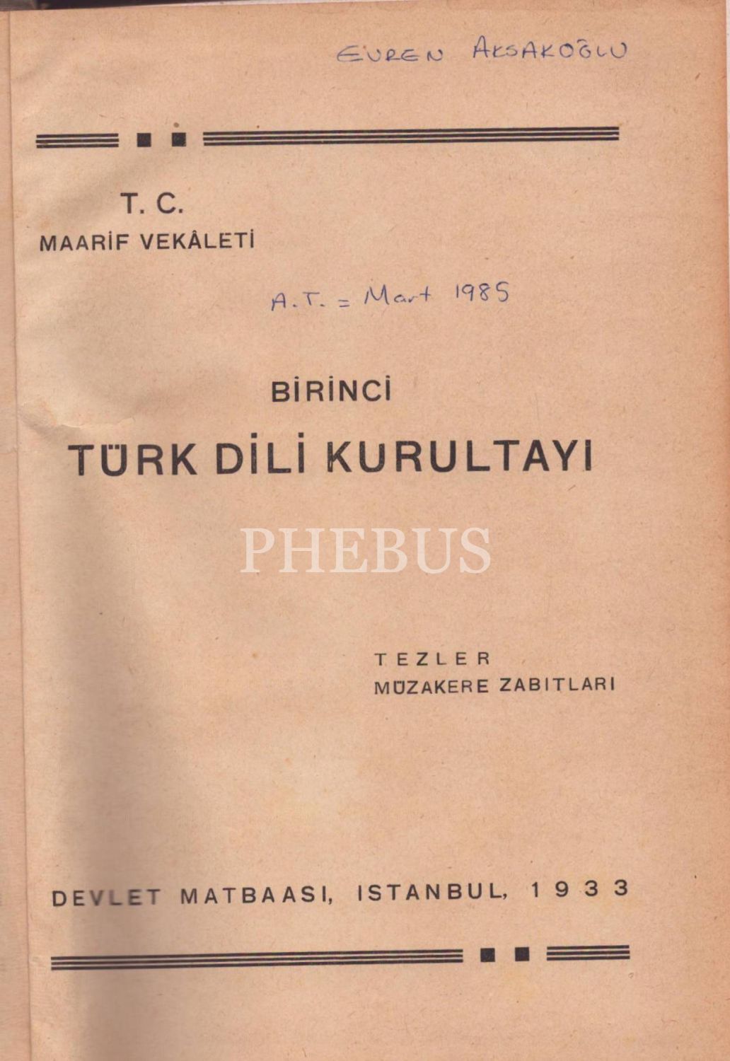 BİRİNCİ TÜRK DİLİ KURULTAYI - Tezler, Müzakere Zabıtları, Komisyon, 1933, T. C. Maarif Vekâleti, 498 sayfa