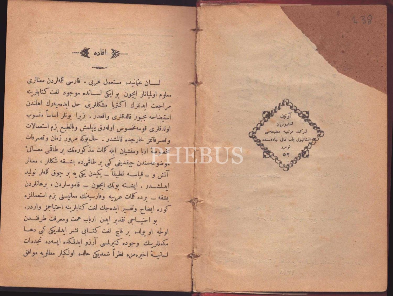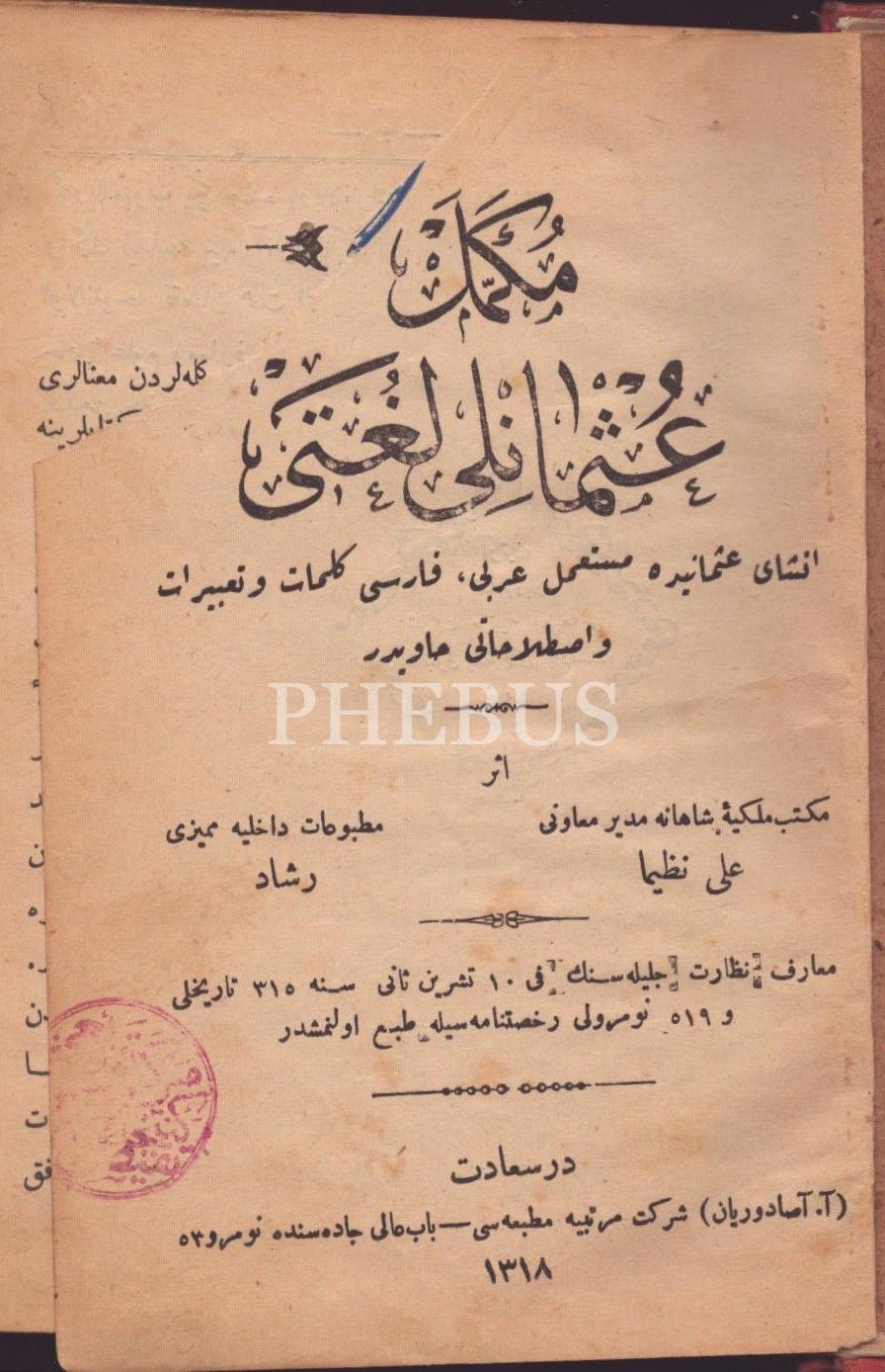 "İnşâ-yı Osmânîde müsta´mel Arabî, Farsî kelimât-ı ve ta´bîrât ve ıstılahâtı hâvidir" *Rumca, Osmanlıca ve Ermenice olarak "Nikoli Mavroyenyadi- Tosya" damgalıdır. Künye sayfası üstten yırtıktır.