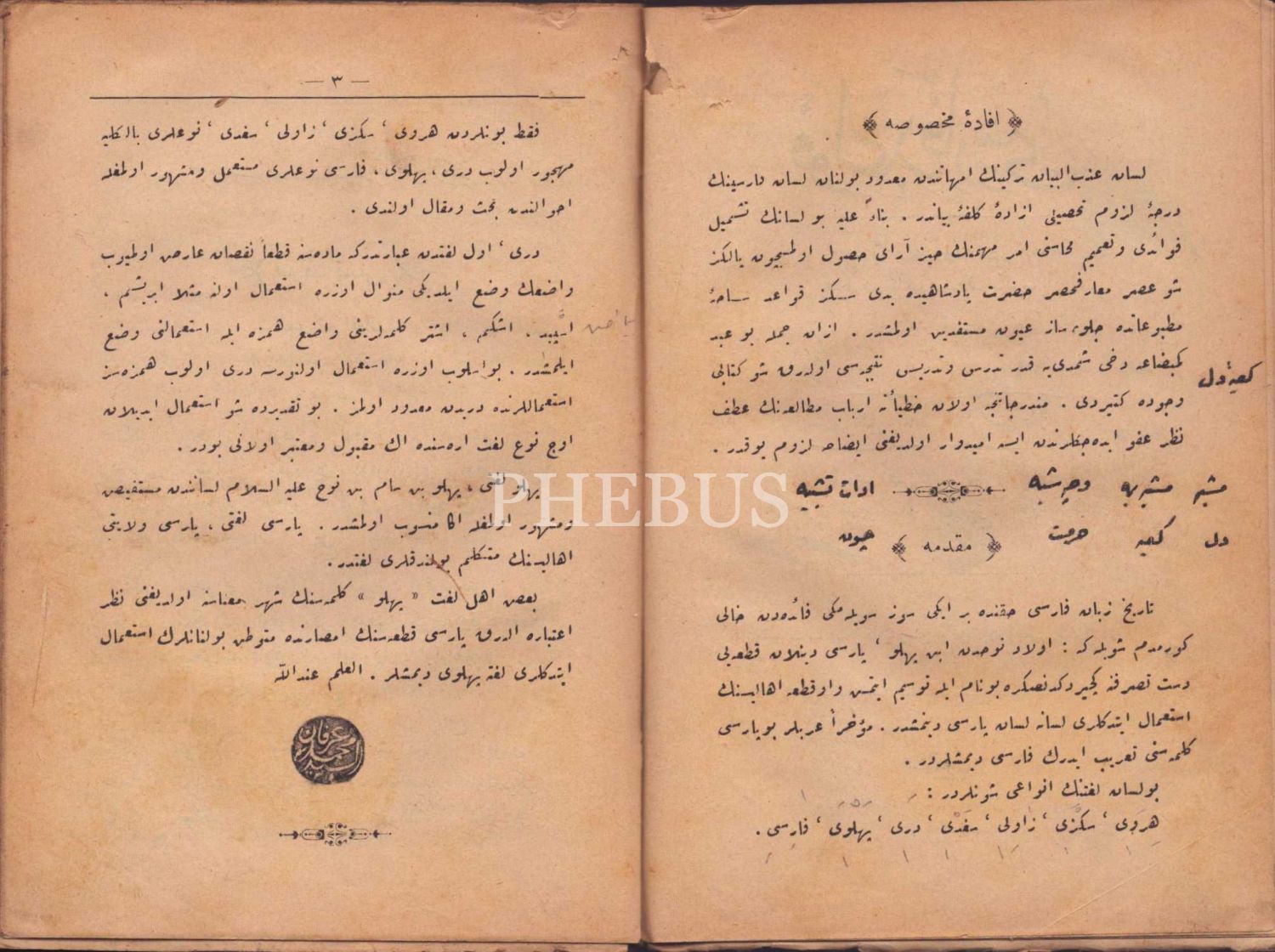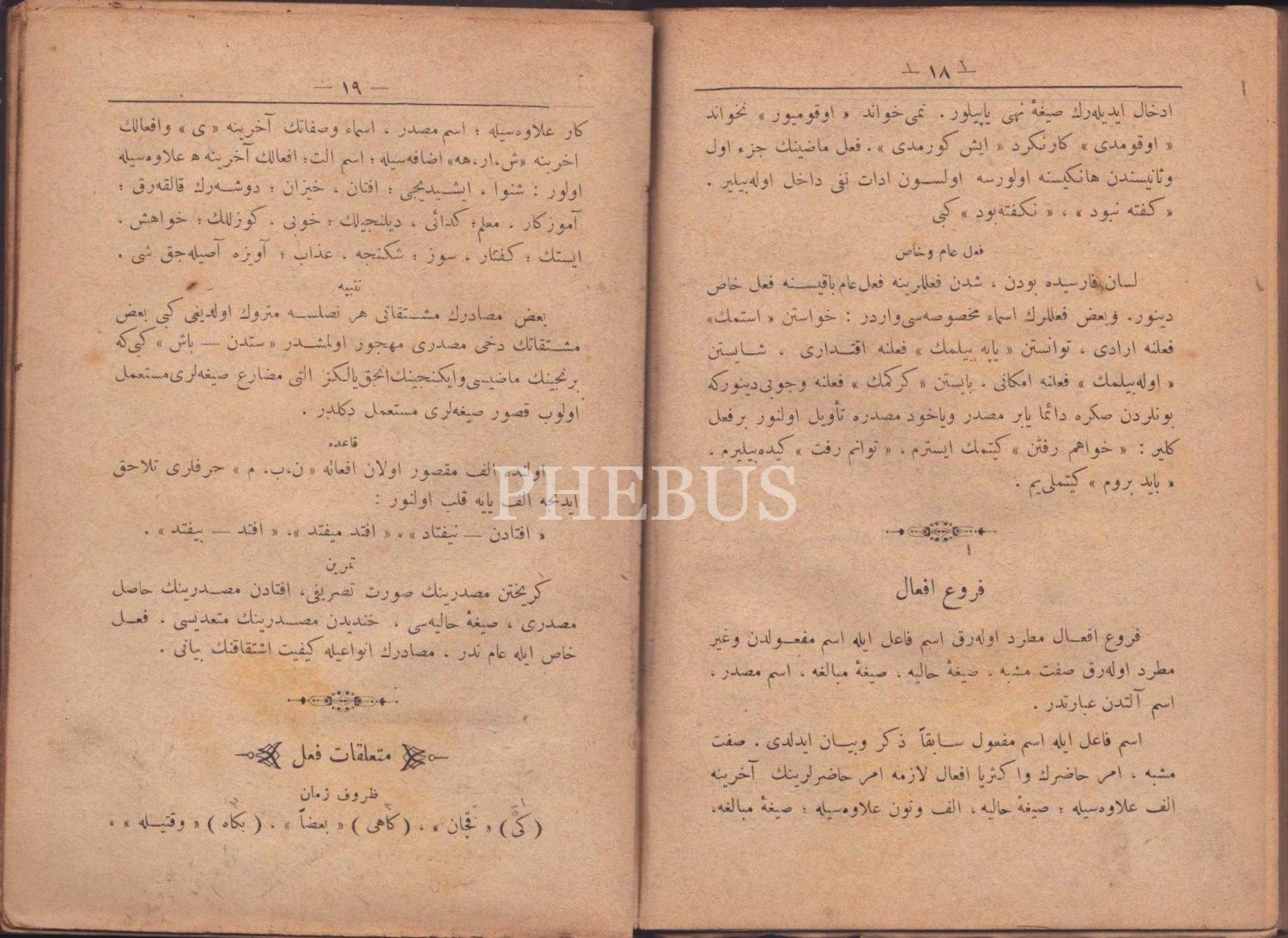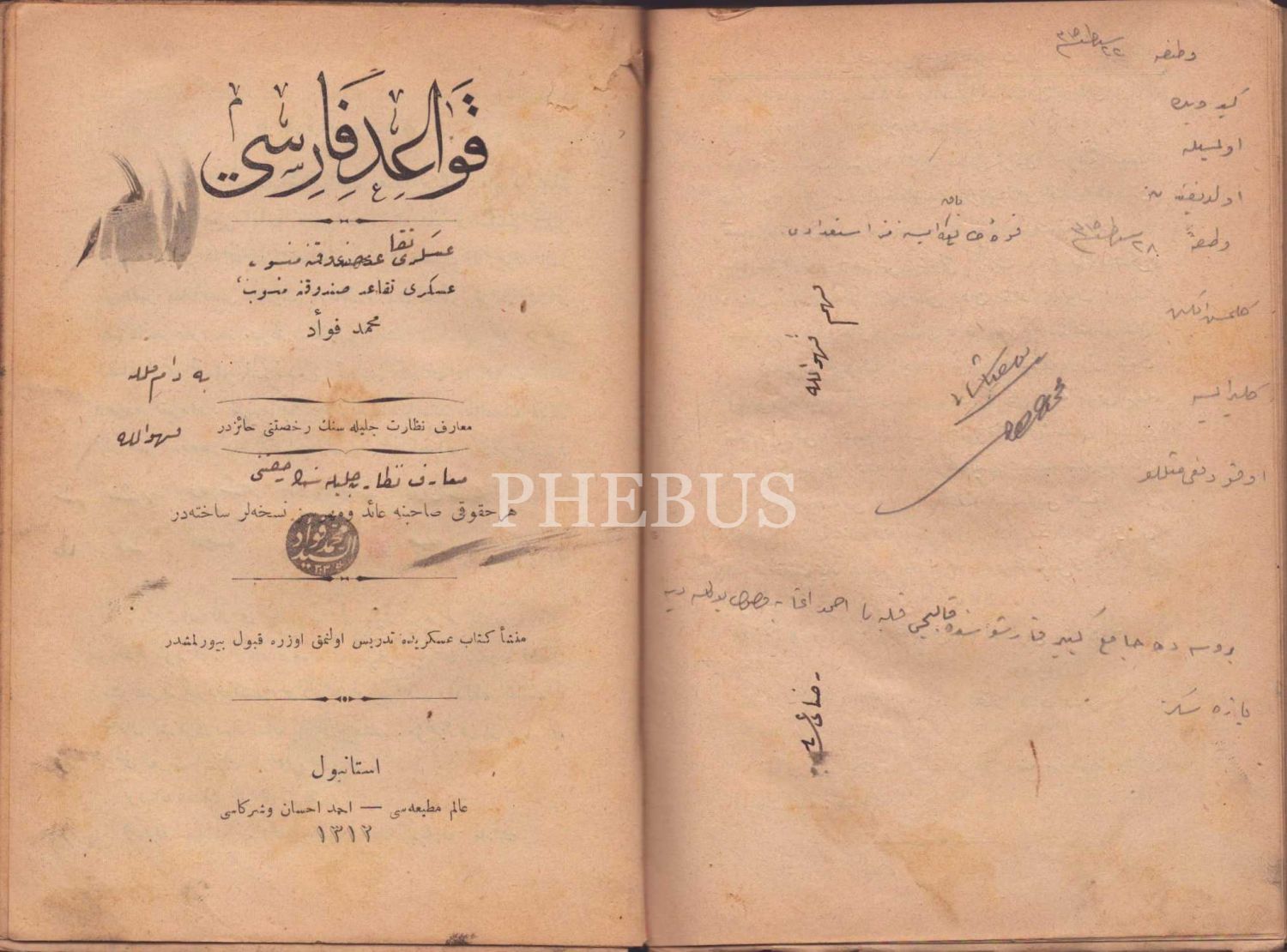 Osmanlı armalı ve ay yıldızlı cildinde 2 eser: LİSÂN-I KİTÂBET, Naci, Mahmud Bey Matbaası, İstanbul 1307, 247 s.; KAVÂİD-İ FÂRİSÎ, Mehmed Fuad, Alim Matbaası, İstanbul 1312, 62 s., 14x20 cm