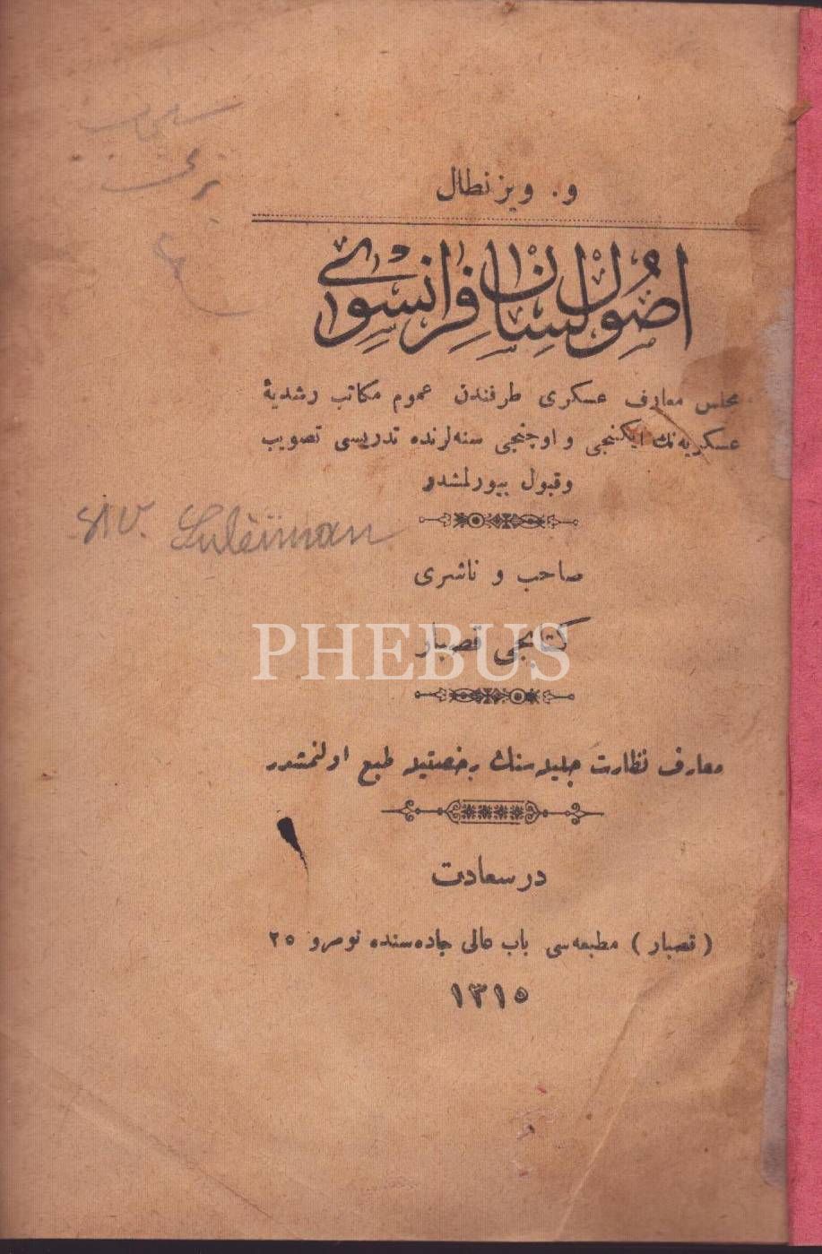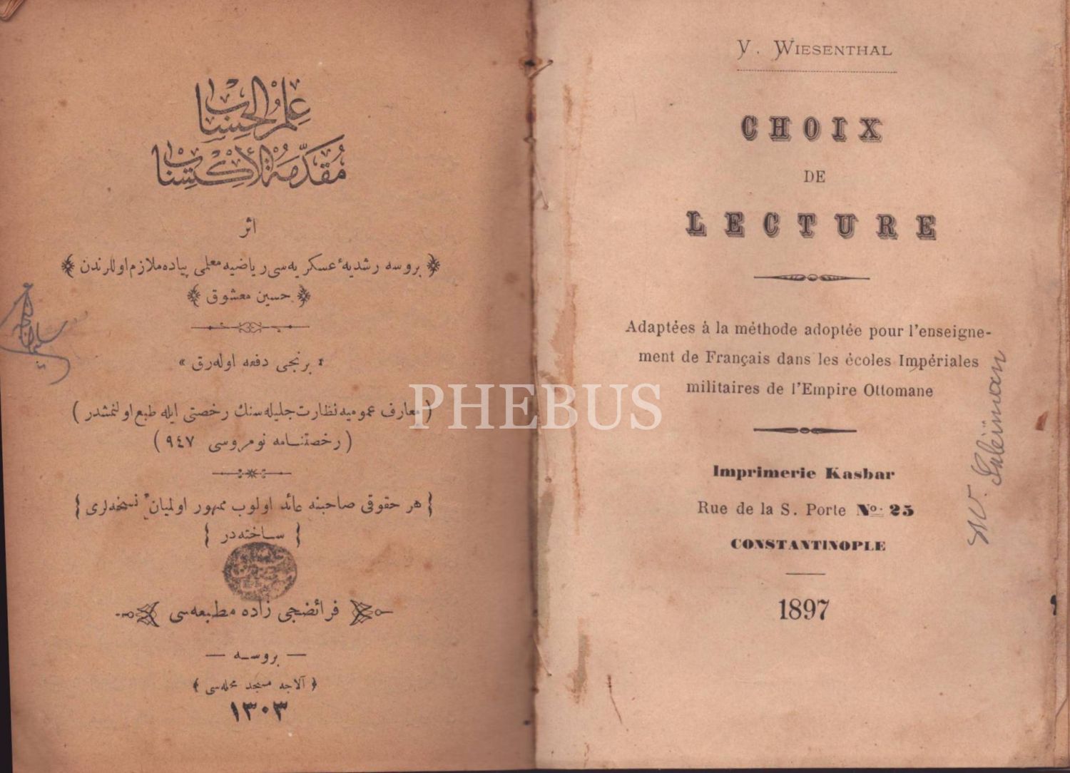 Osmanlı armalı ve ay yıldızlı ciltte 5 eser: USÛL-İ LİSÂN-I FRANSEVÎ, V. Wiesenthal, Kasbar Matbaası, İstanbul 1315, 234 s; CHOIX DE LECTURE, V. Wiesenthal, Kasbar Matbaası, İstanbul 1897, 139+11 s.;