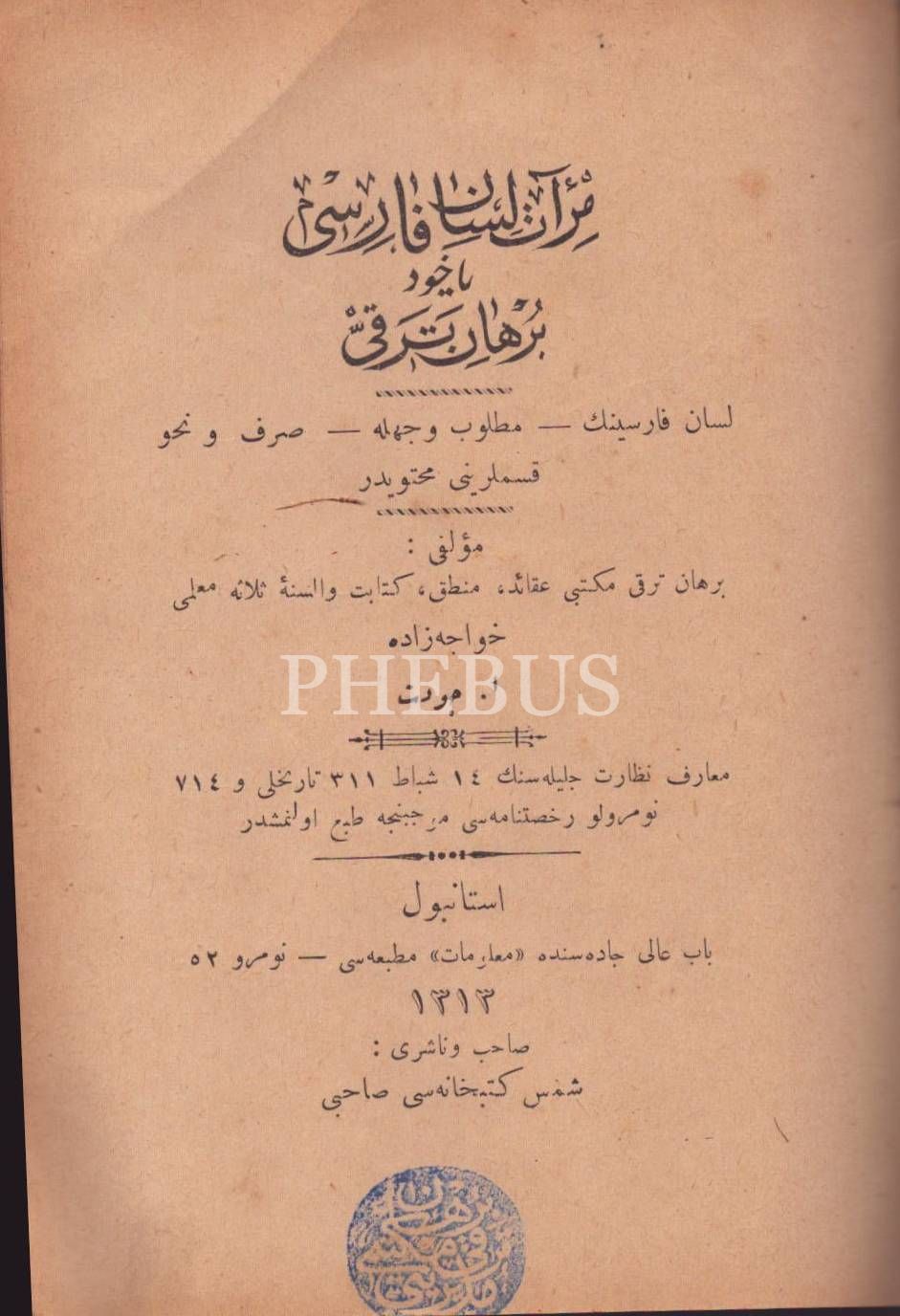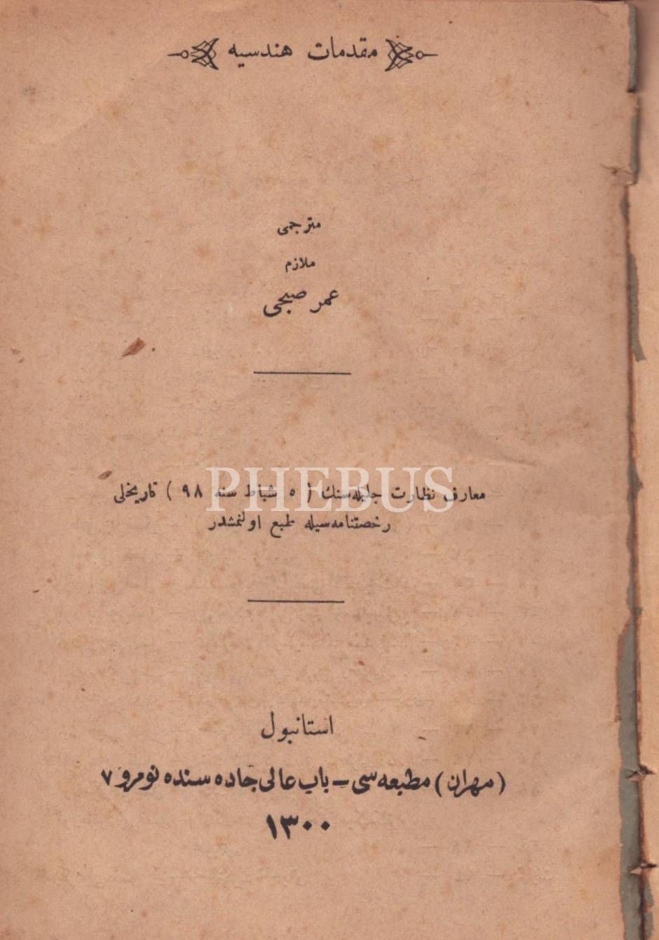 İLMÜ´L-HESÂB MUKADDİMETÜ´L-İKTİSÂB, Hüseyin Maşuk, Feraizcizâde Matbaası, Bursa 1303, 324 s.; MİR´ÂT-I LİSÂN-I FÂRİSÎ YÂHÛD BURHÂN-I TERAKKÎ, Hocazâde A. Cevdet, Malumat Matbaası, İstanbul 1313, 60 s.; MUKADDİMÂT-I HENDESİYYE, Ömer Subhi, Mihran Matbaası, İstanbul 1300, 100 s.; 13x19 cm *Sırtı kısmen ayrıktır.