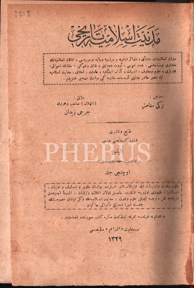 MEDENİYYET-İ İSLÂMİYYE TÂRÎHİ (3. Cilt), Corci Zeydan, çev. Zeki Megamiz, İkdam Matbaası, İstanbul 1329, 424 s., 17x25 cm