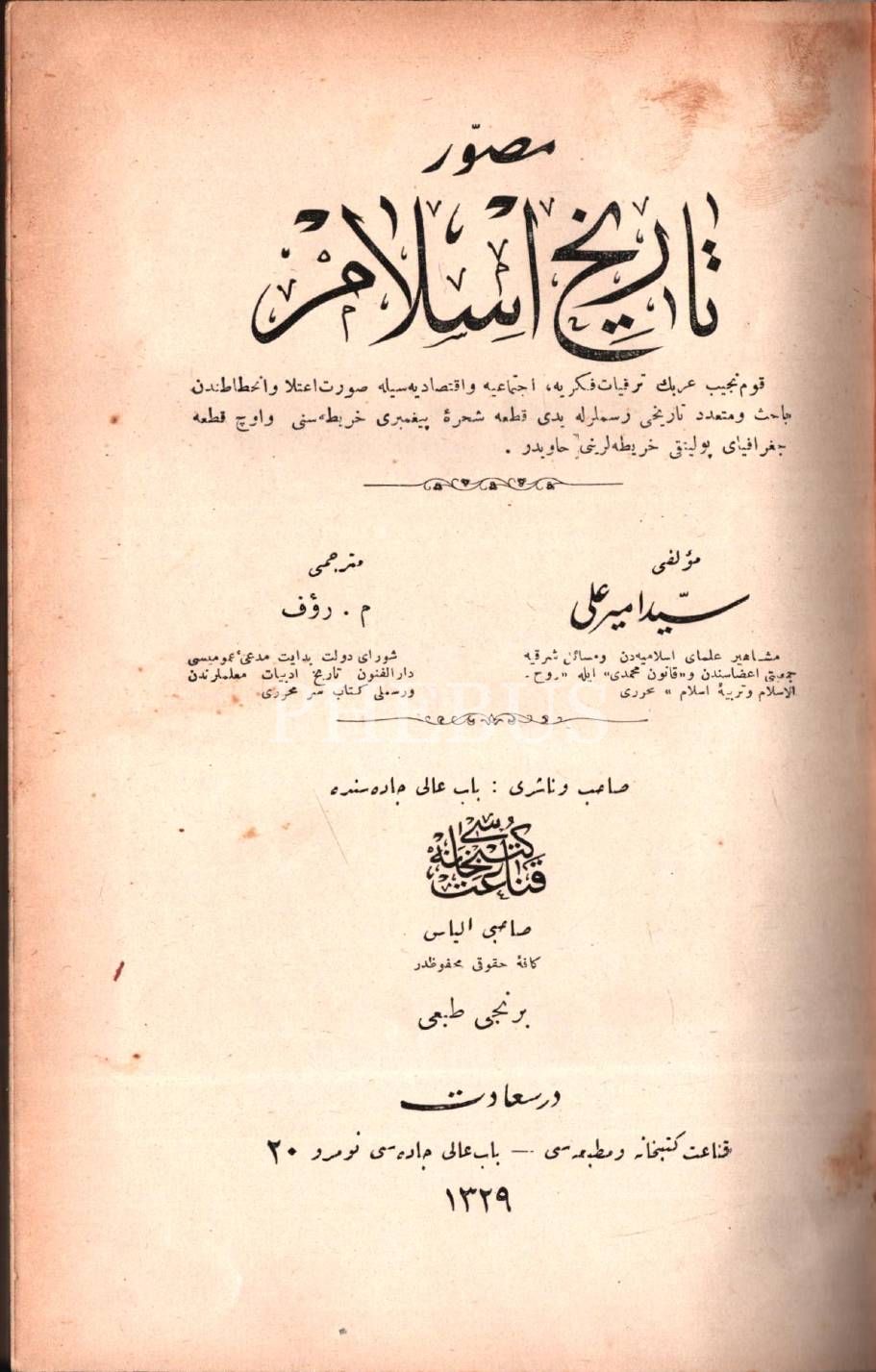 MUSAVVER TÂRÎH-İ İSLÂM (1. Cilt), Seyyid Emir Ali, çev. M. Rauf, Kanaat Matbaası, İstanbul 1329, 320 s., 17x25 cm