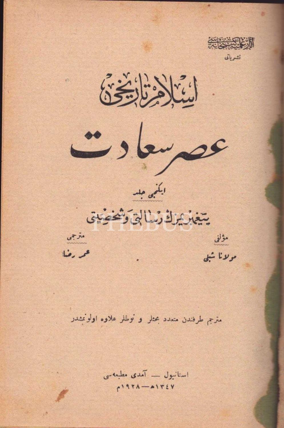 İSLÂM TÂRÎHİ- ASR-I SAÂDET (2. Cilt: Peygamberimizin Risâleti ve Şahsiyeti), Mevlâna Şiblî, çev. Ömer Rıza, Amedi Matbaası, İstanbul 1928, 1080 s., 14x20 cm