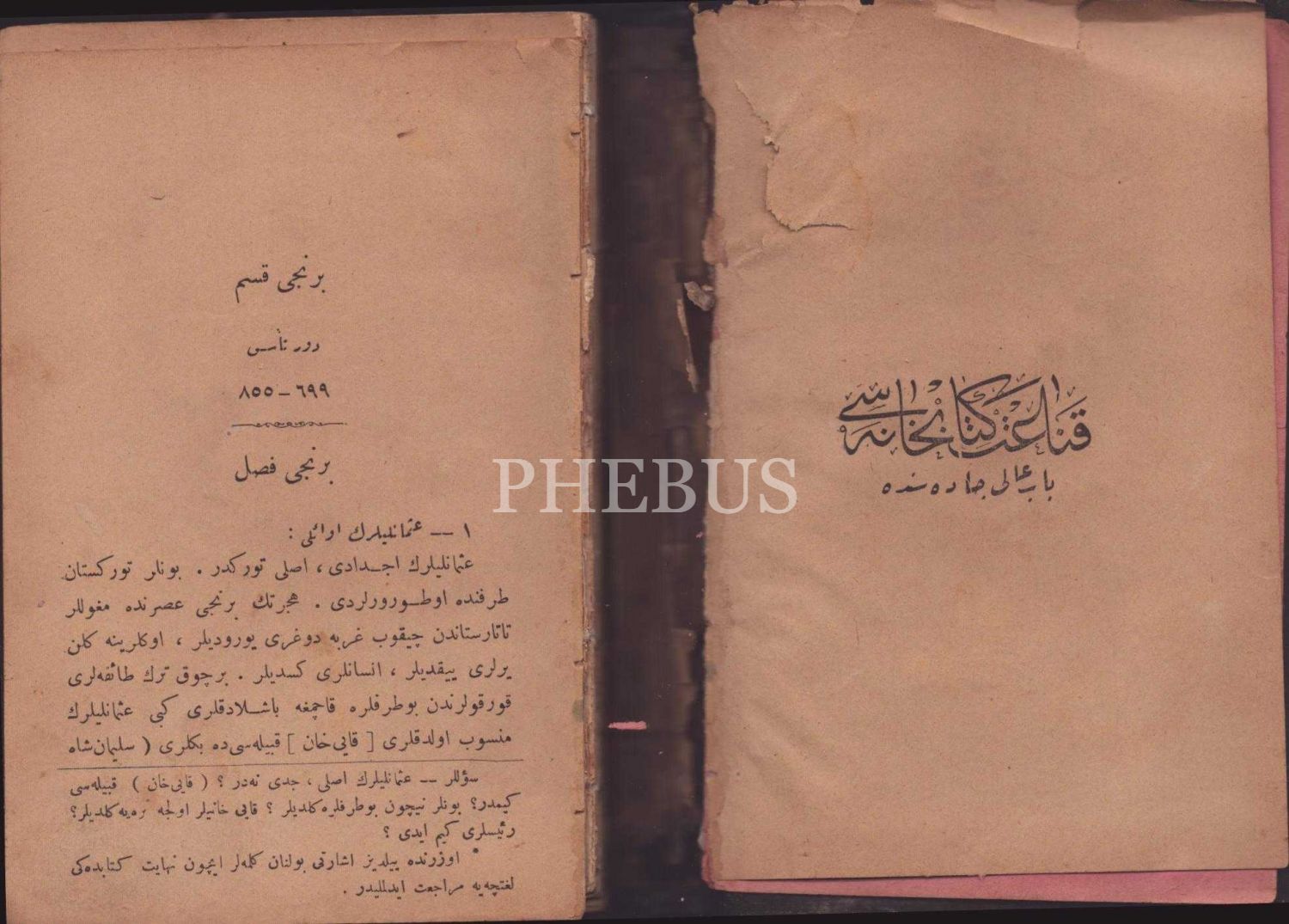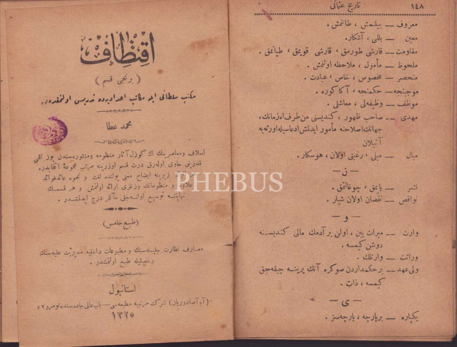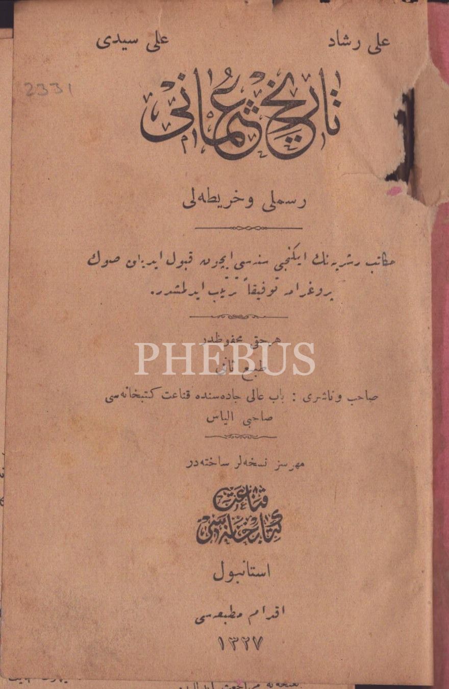 Tuğralı ve Meşrutiyet temalı bez cildinde TÂRÎH-İ OSMÂNÎ (Resimli ve Haritalı), Ali Reşad-Ali Seydi, İkdam Matbaası, İstanbul 1327, 148 s.; İKTİTÂF (1. Kısım), Mehmed Atâ, A. Asaduryan Şirket-i Mürettibiye Matbaası, İstanbul 1325, 156 s., 12x18 cm