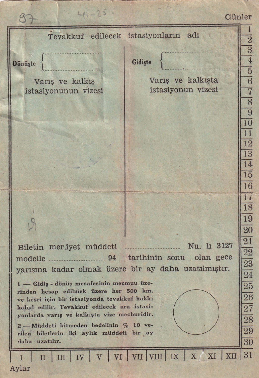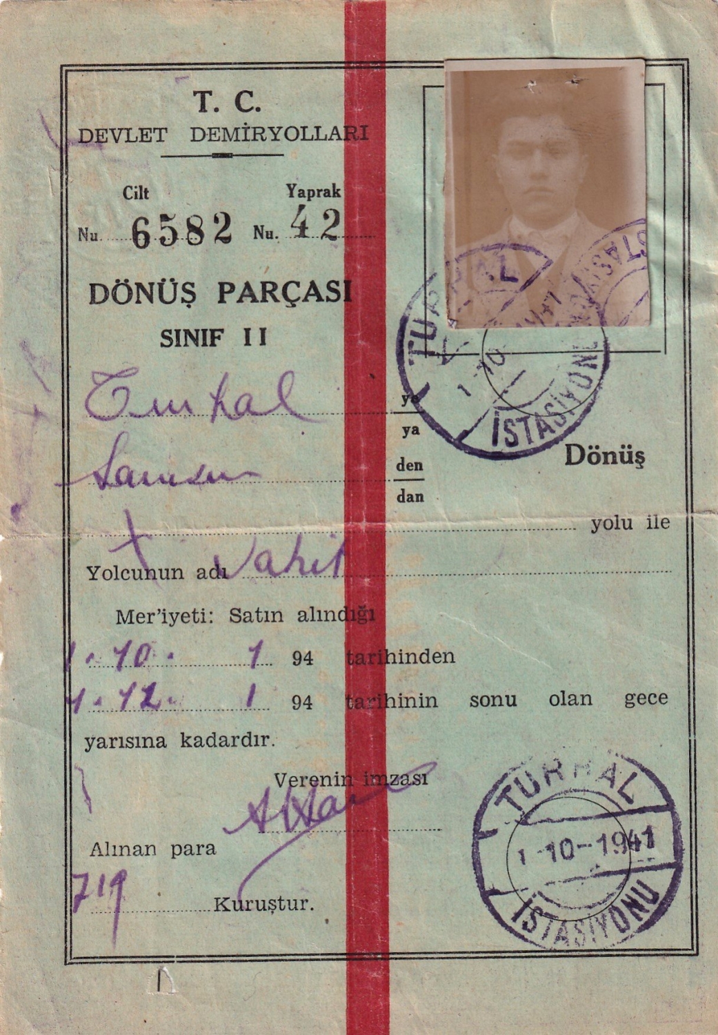 Devlet Demiryolları, Turhal İstasyonu damgalı, 1941 tarihli bilet