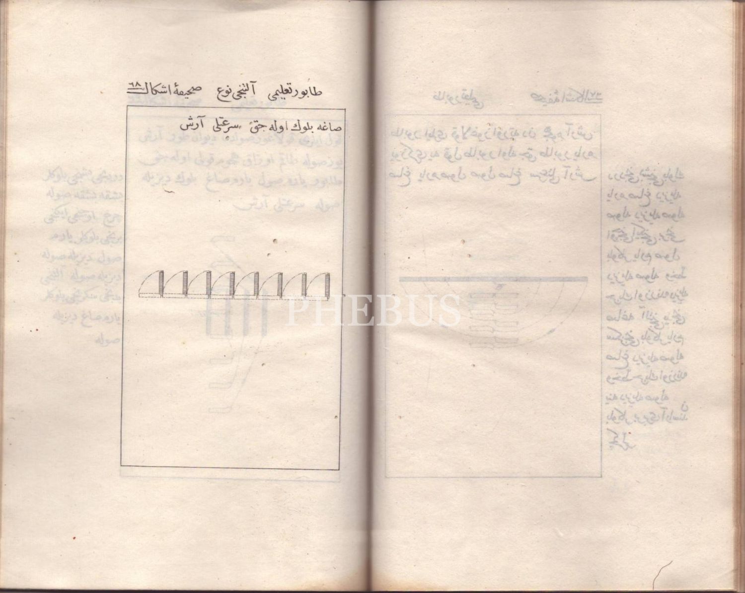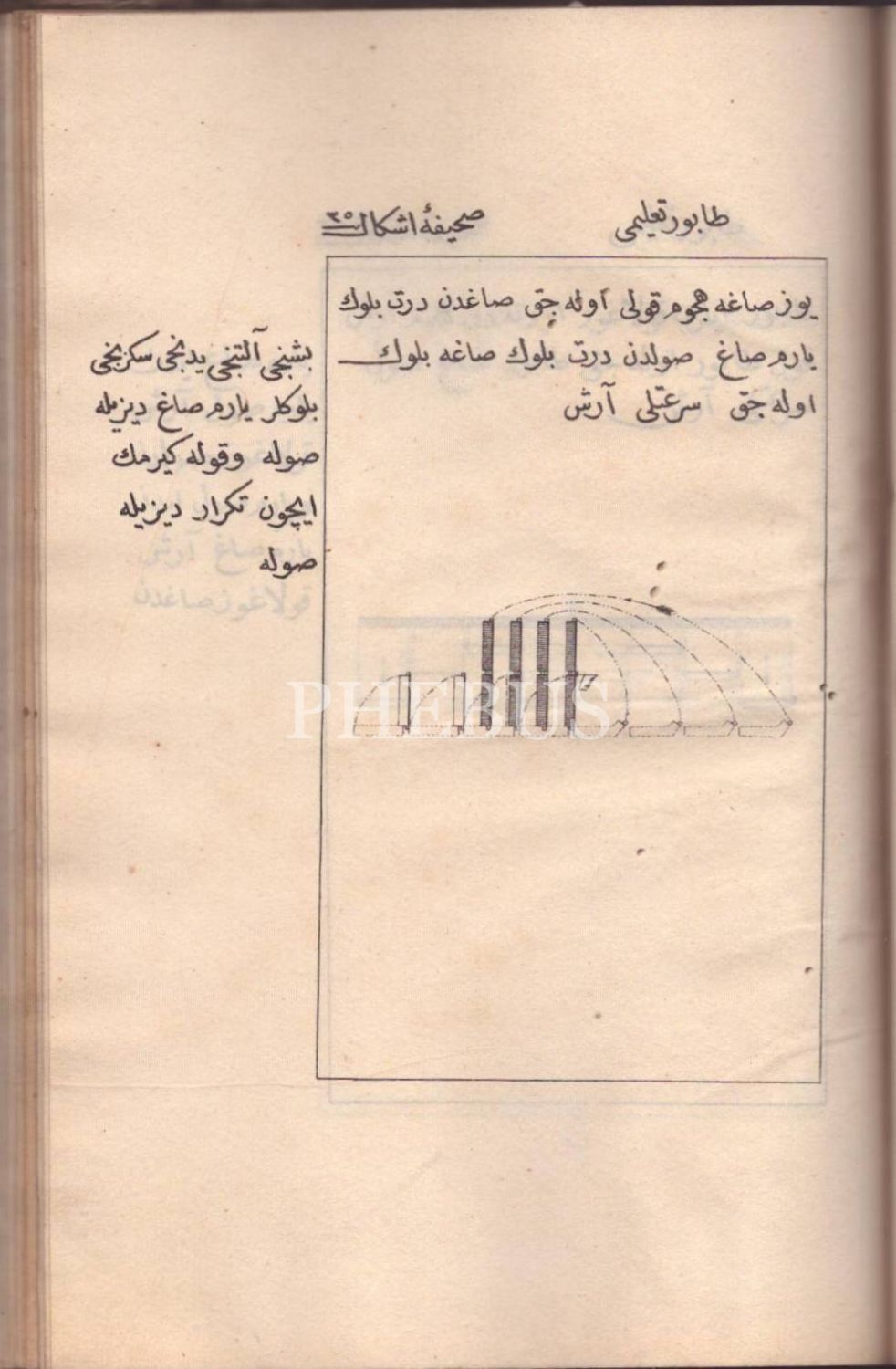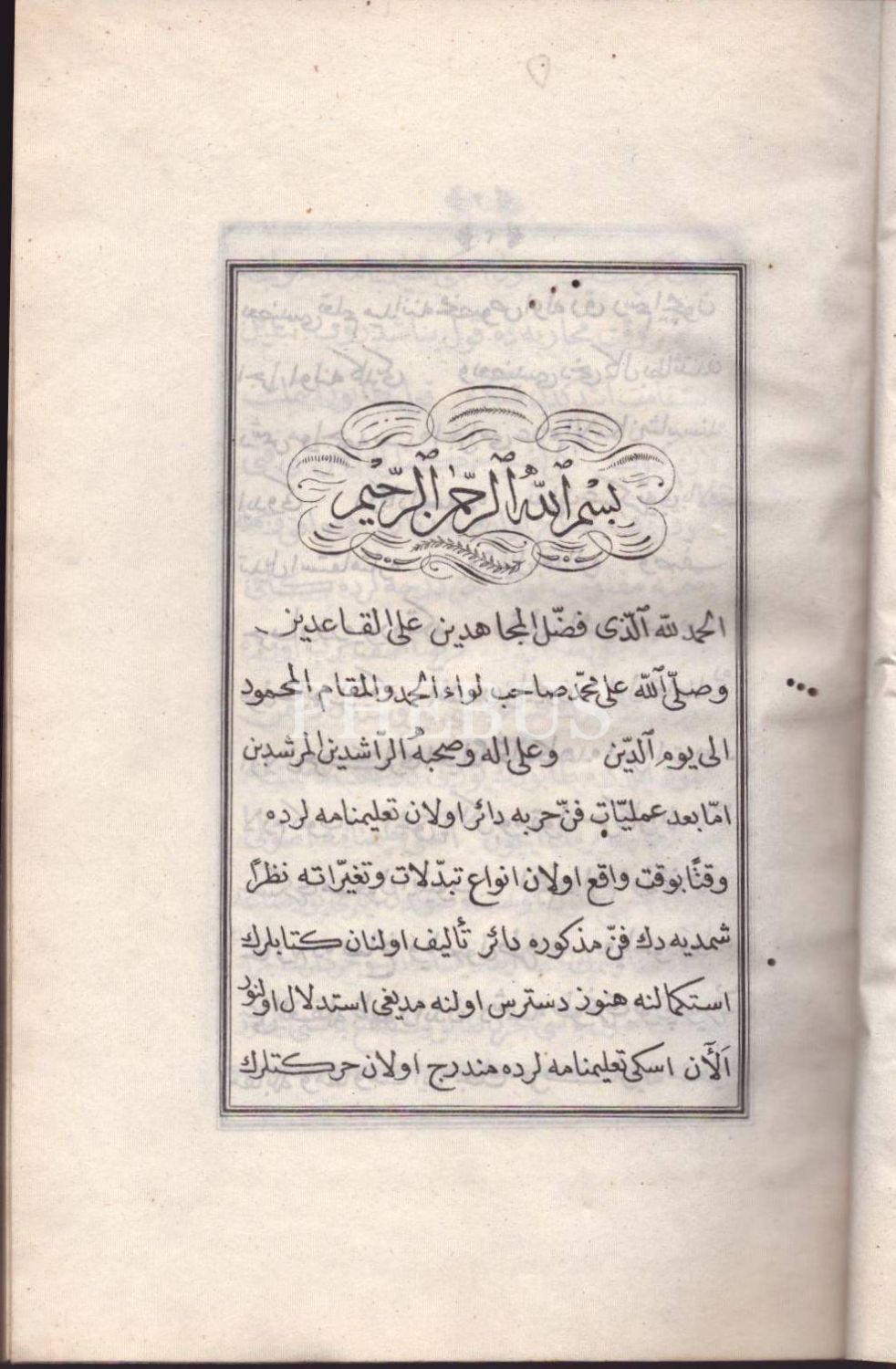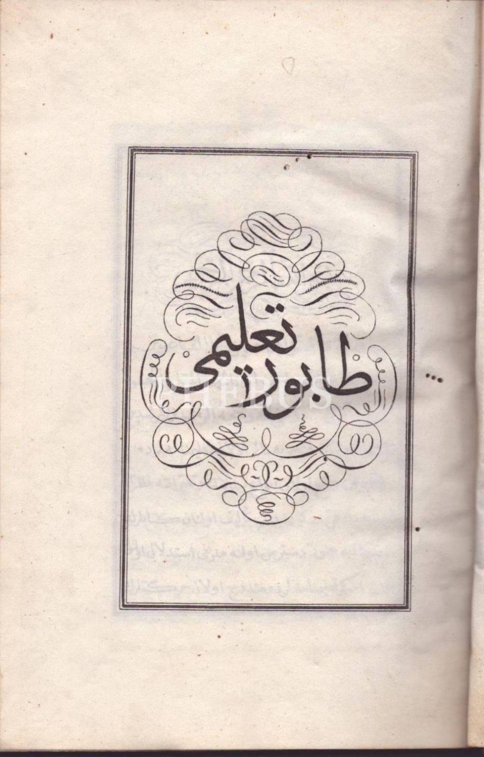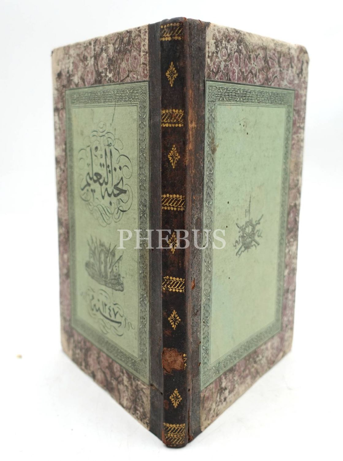 Deri sırtlı ve ebrulu cildinde, ilk taşbaskı kitabımız NUHBETÜ´T-TA´LÎM- TABUR TA´LÎMİ, Koca Hüsrev Paşa, 1247, 13 sayfa metin+79 sayfa planş/çizim, 13x20 cm
