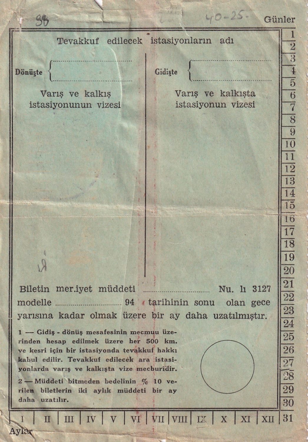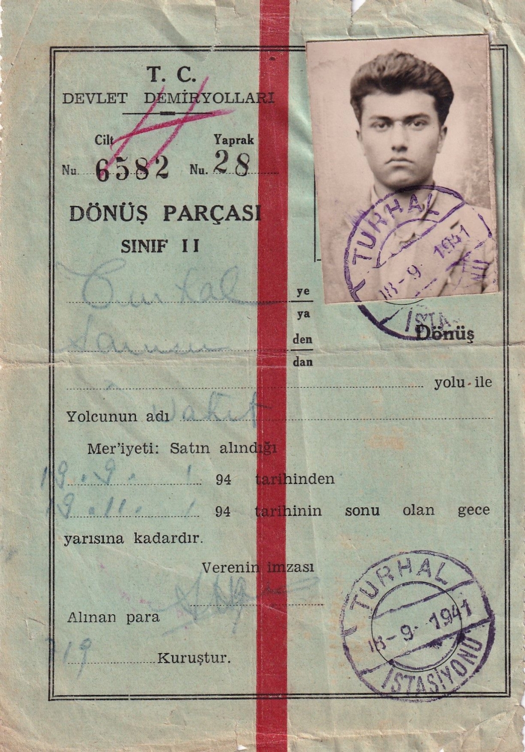 Devlet Demiryolları, Turhal İstasyonu damgalı, 1941 tarihli bilet